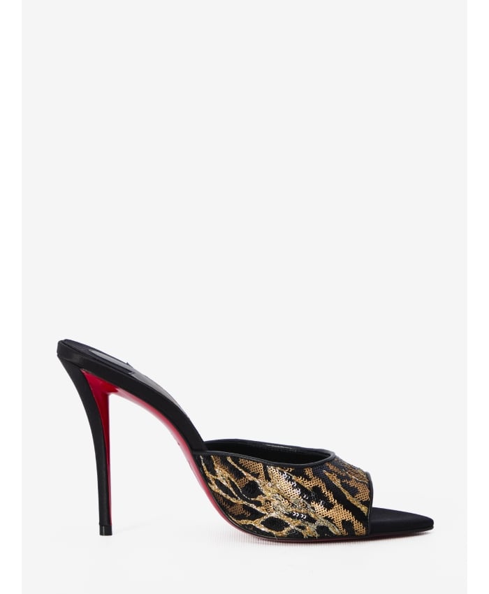 Miss Z Mule Ocelot in embroidered crepe satin with animal-print sequins and golden lurex. They feature an open-toe design, a stiletto heel, a branded