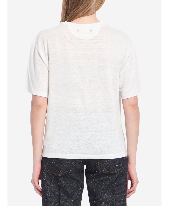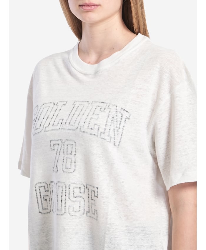 Lightweight white linen short-sleeve crewneck t-shirt. It features a faded black Golden Goose 78 logo on the front, double star detail on the back,