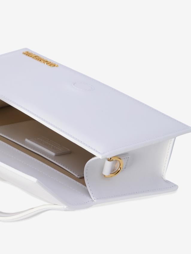 Le Grand Bambino bag in smooth white leather. It features a fixed top handle, a magnetic closure with a flap, visible stitching, a gold-tone metal