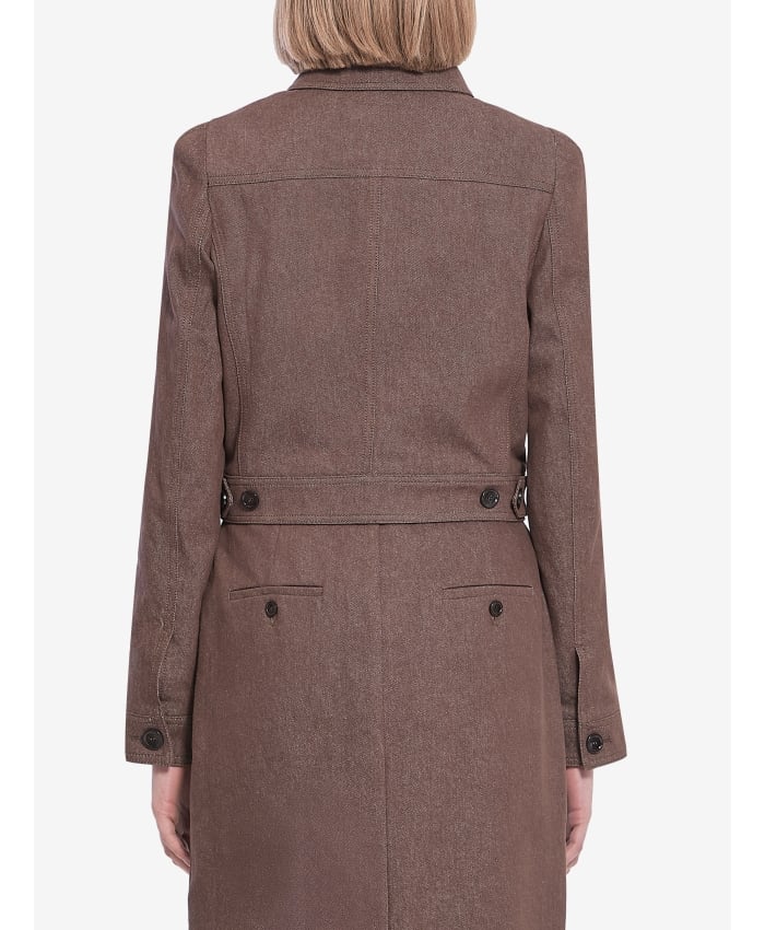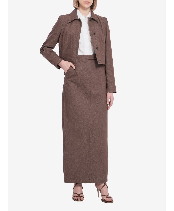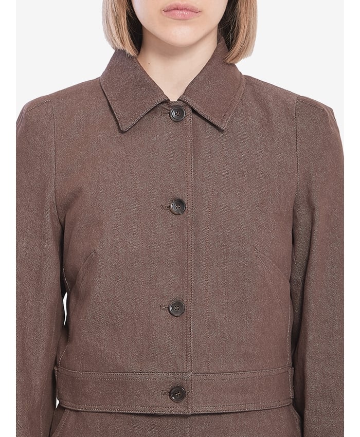 Cropped jacket in brown denim-effect cotton. It features a pointed collar, front button closure, stitched dart detailing on the front and shoulders,
