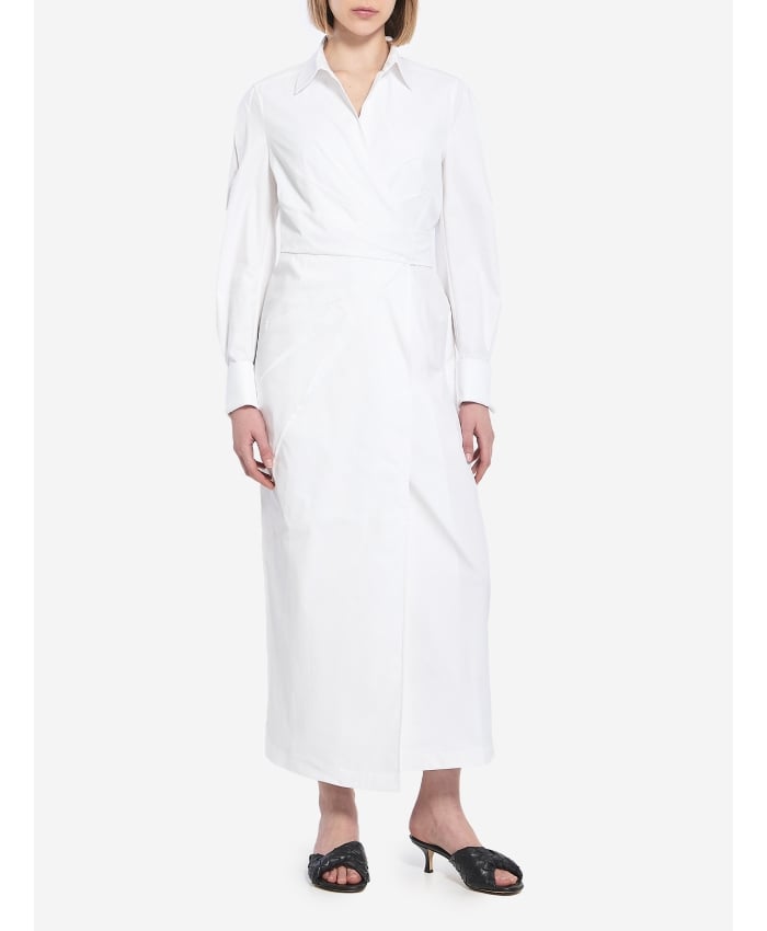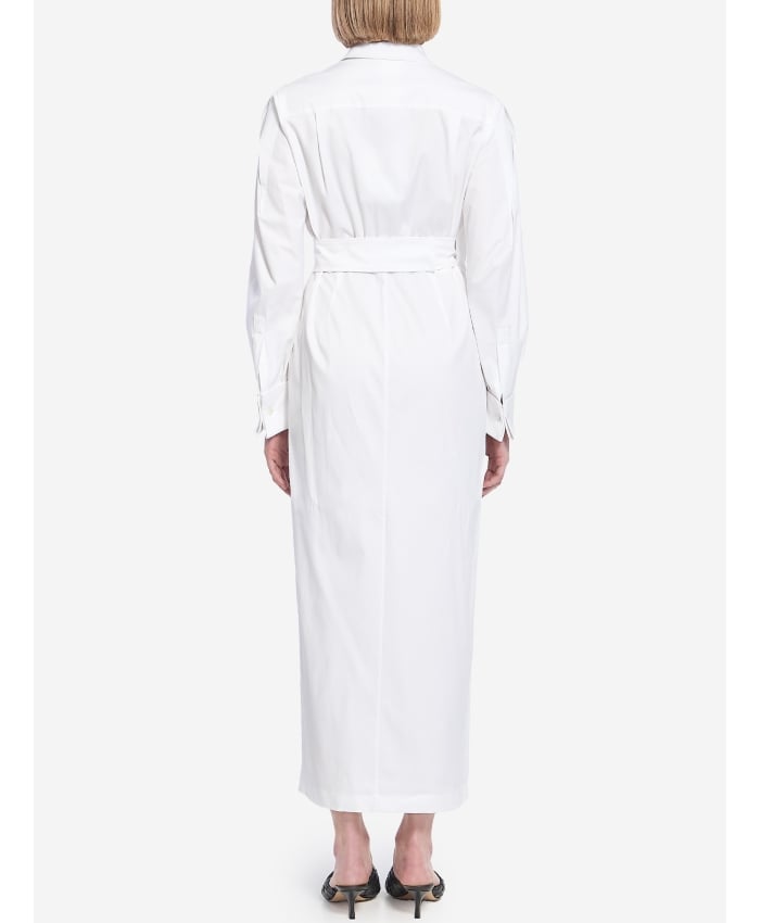 Long shirt dress in white stretch cotton twill. It features a buttoned shirt collar, a wrap-around closure at the waist with stitched asymmetric