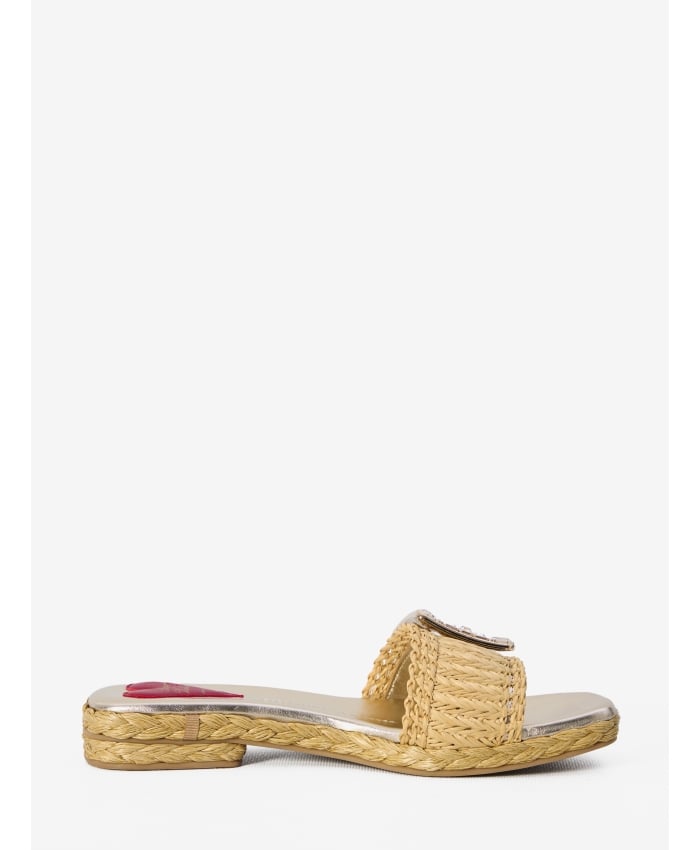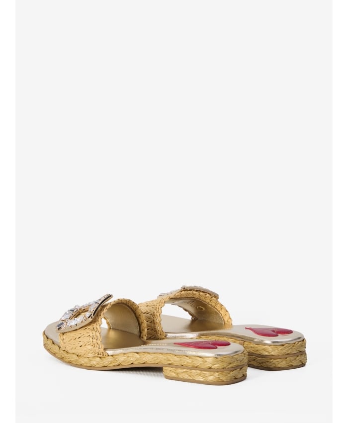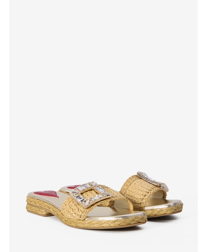 Sandals in raffia-like material with a square buckle adorned with crystals on the upper. They feature raffia-like detailing along the edges, a golden