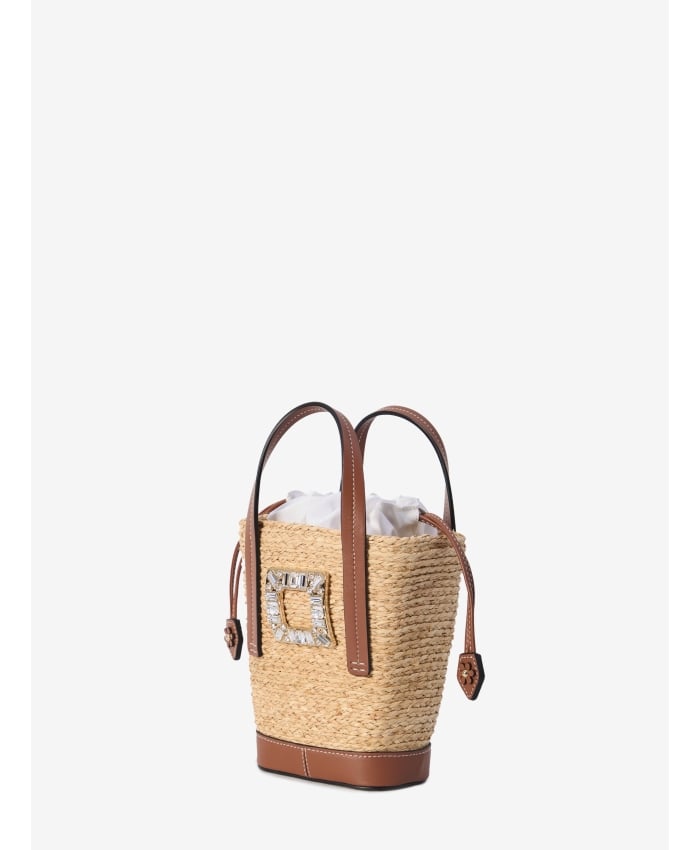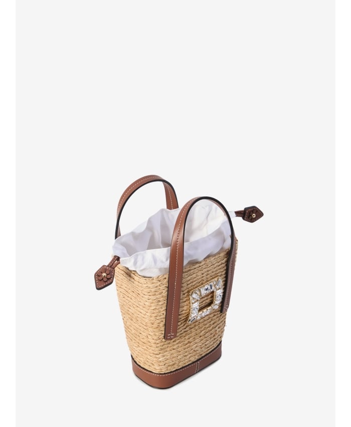 Viv' Skate mini bucket bag in raffia with brown leather trims. It features two brown leather top handles, a removable shoulder strap, a