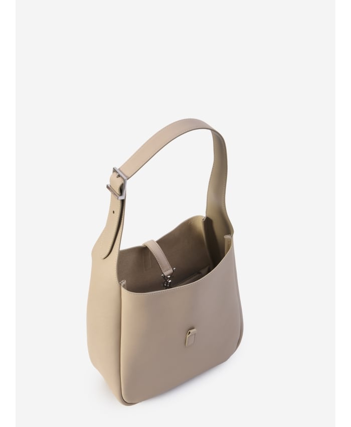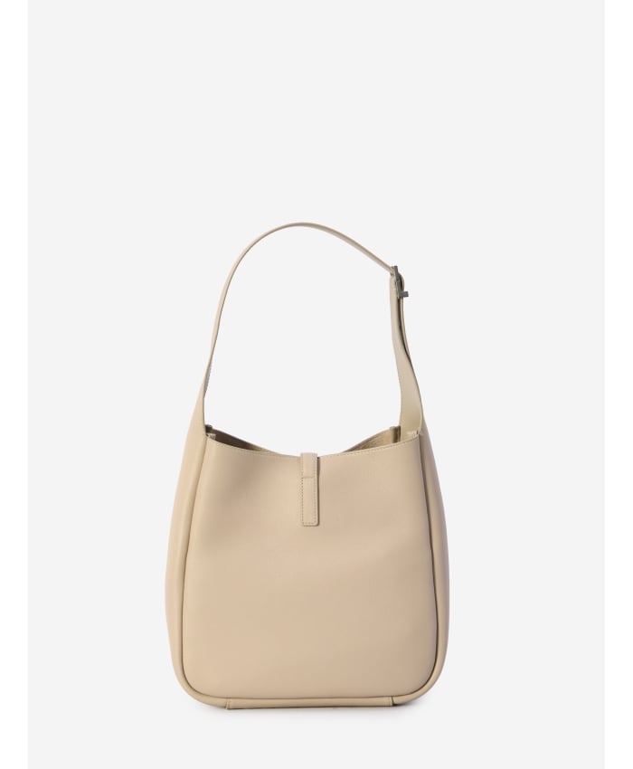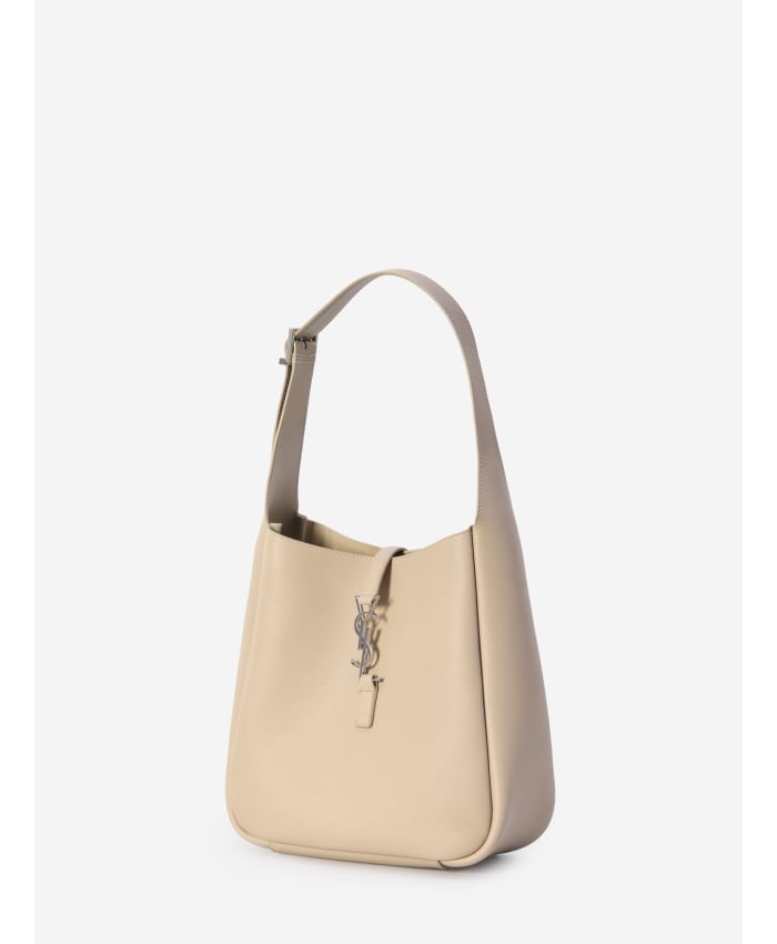 Le 5 à 7 small bag in soft sand-colored calfskin. It features hook closure with silver-tone metal Cassandre, adjustable top