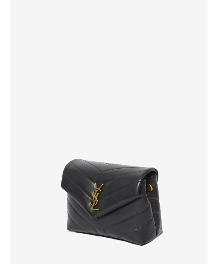 LouLou Toy crossbody bag in black quilted calfskin with gold-tone metal YSL monogram on the front. It features adjustable and detachable shoulder
