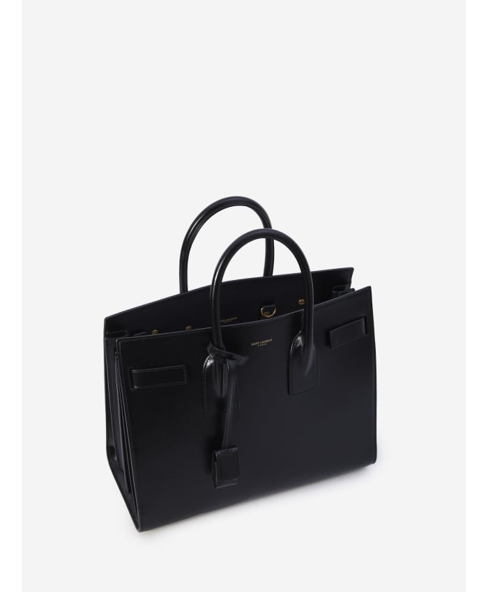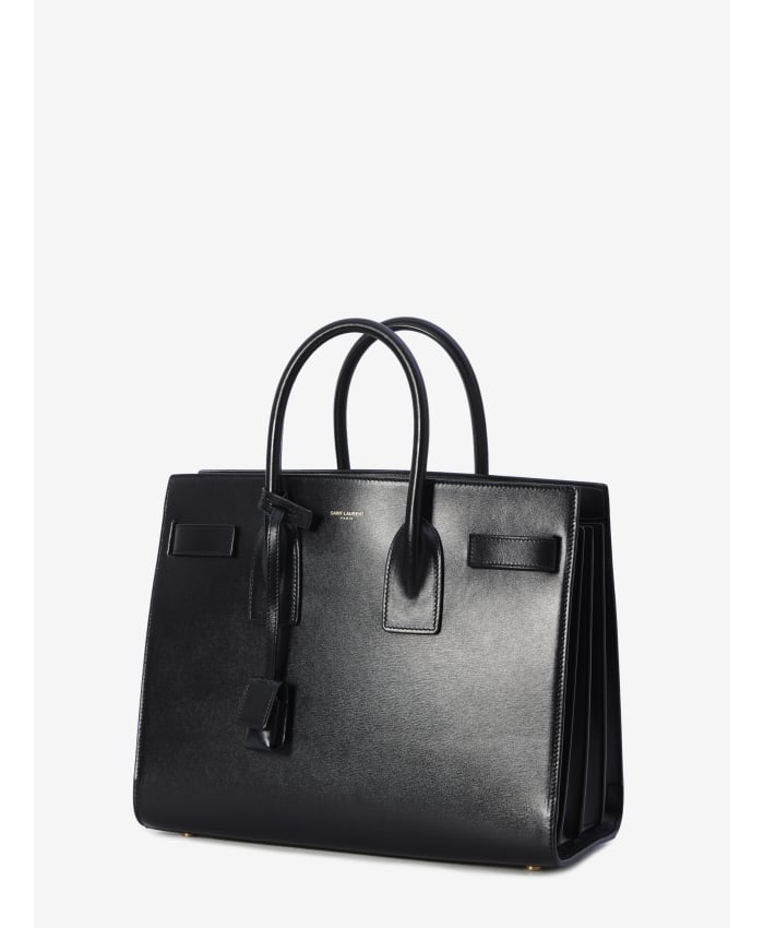 Small Sac De Jour bag in smooth black calfskin leather with an embossed Saint Laurent logo on the front. It features dual fixed handles, side