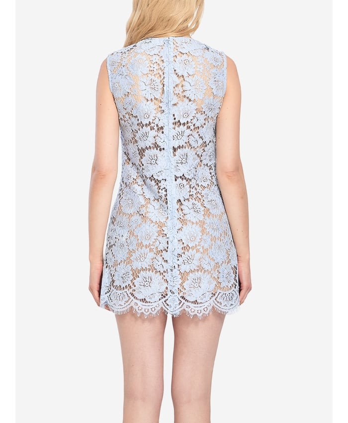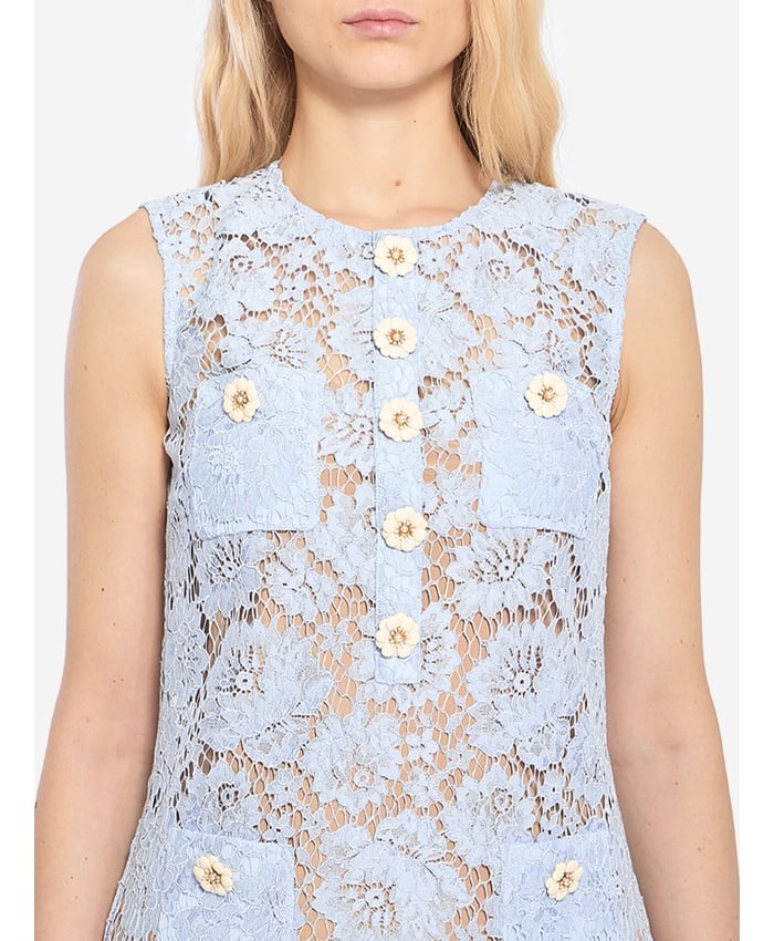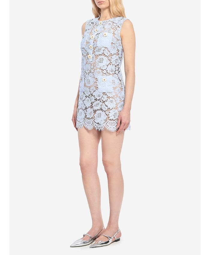 Sleeveless mini dress in baby blue lace. It features a round neckline, decorative flower-shaped buttons on the front, four applied front pockets with