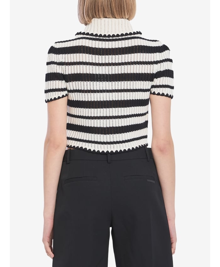 Short-sleeve crochet top in black and white stripes with semicircular trim. It features a pointed collar, front closure with gold-tone metal buttons,