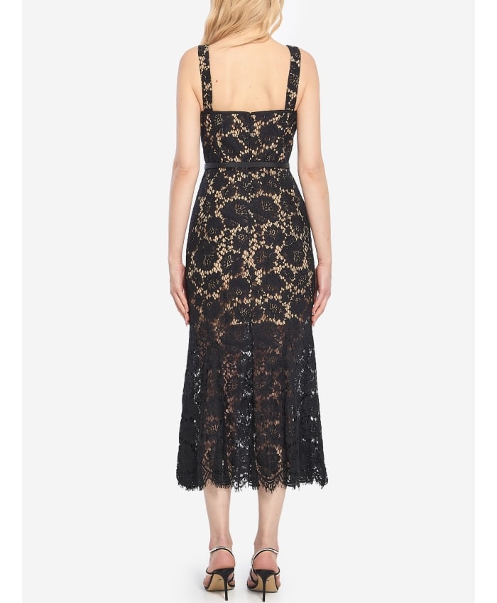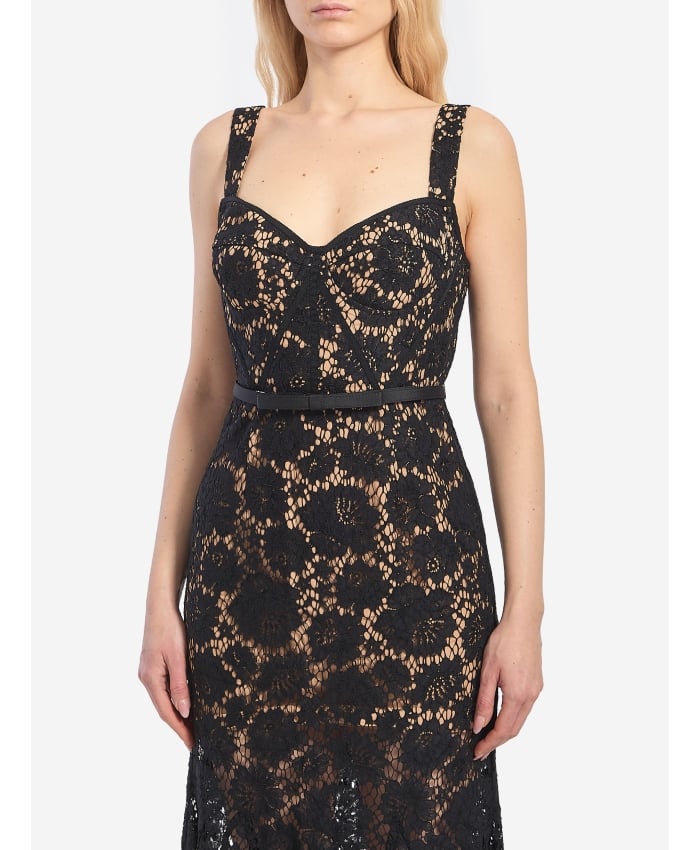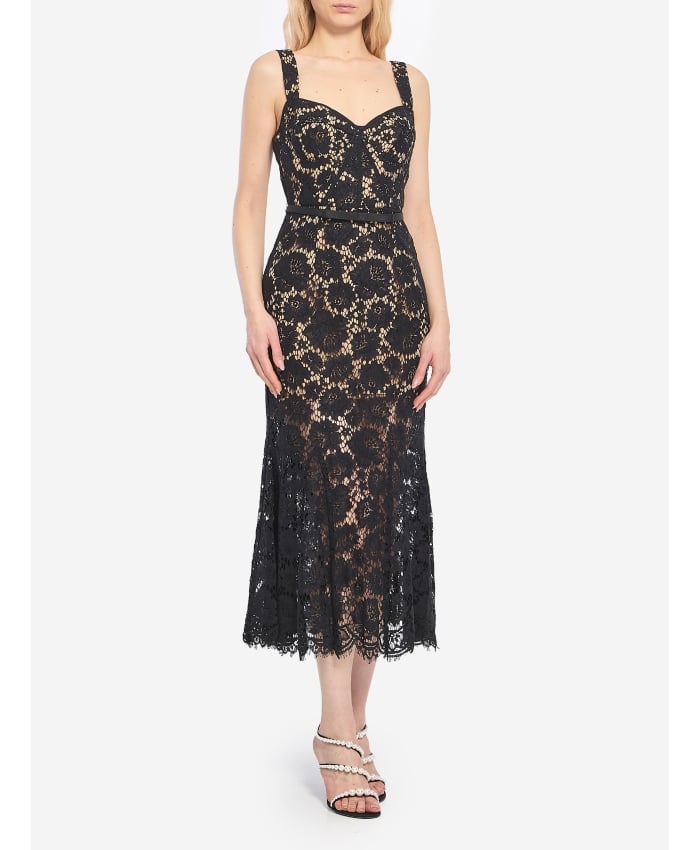 Sleeveless midi dress in black lace. It features lace straps, a sweetheart neckline, a bustier-style bodice, an integrated nude bra with hook-and-eye