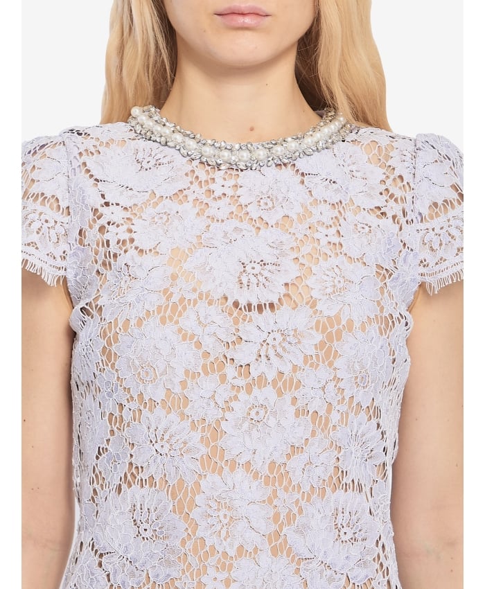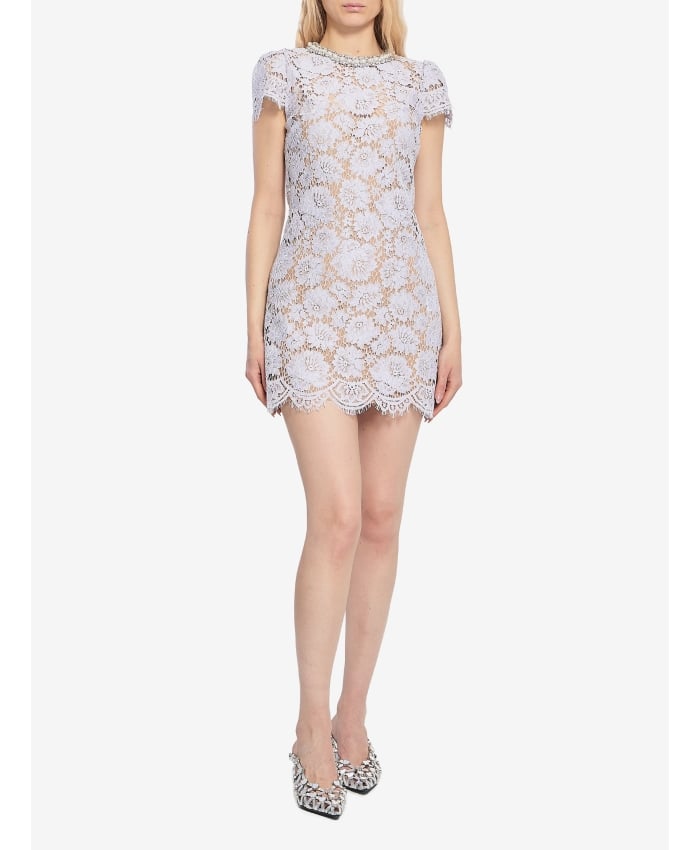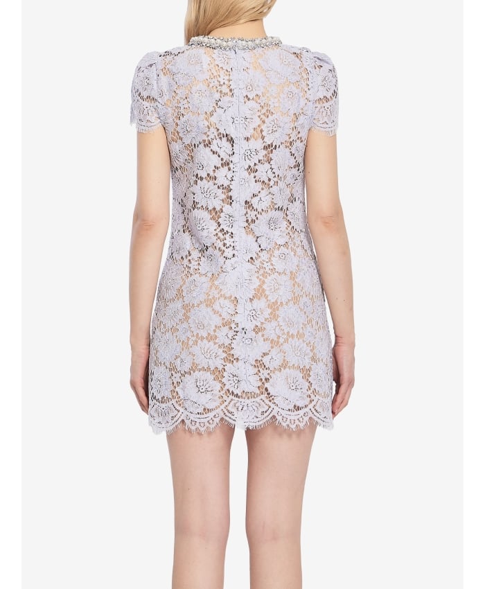 Lilac lace mini dress. It features a round neckline embellished with pearls and crystals, short sleeves, a concealed back zip closure, and a
