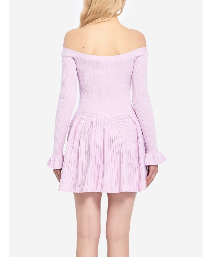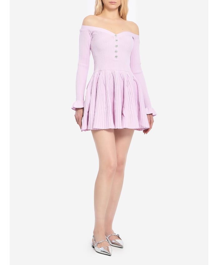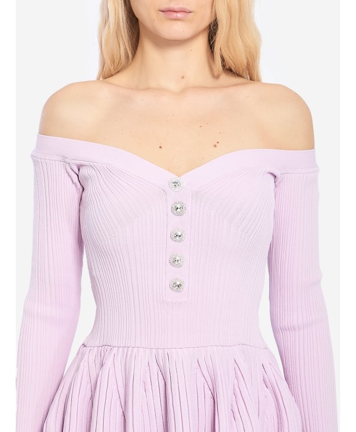 Pink ribbed knit mini dress. It features an off-the-shoulder neckline, decorative crystal buttons, long sleeves with flared cuffs, and a flared