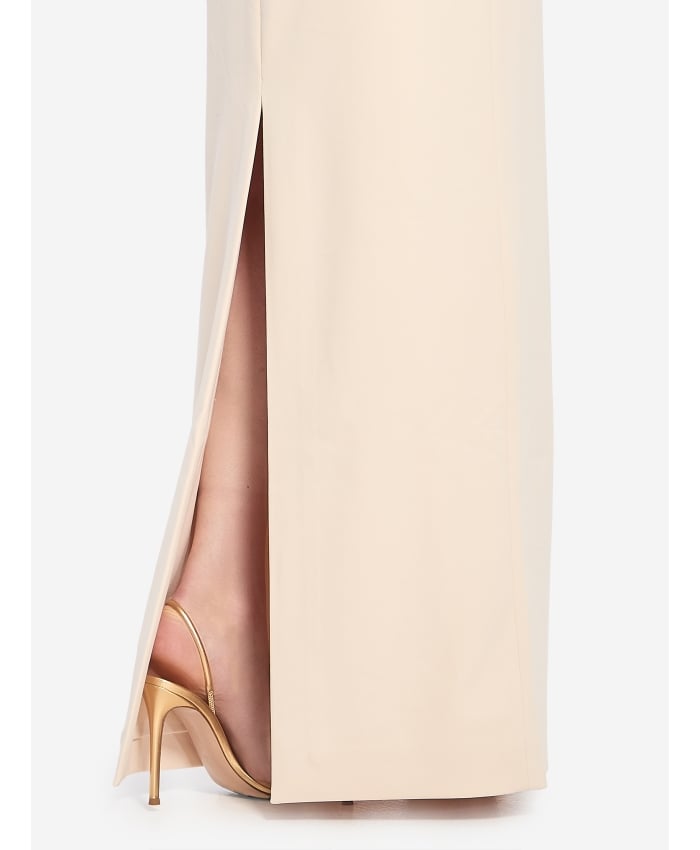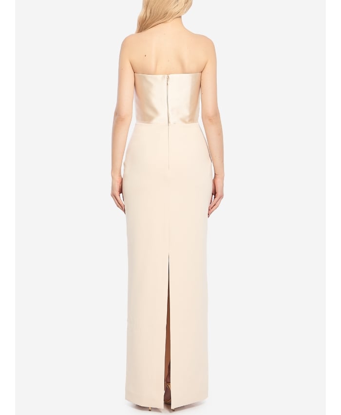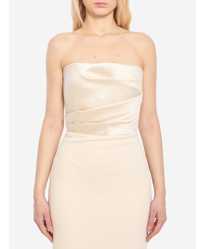 Afra long sleeveless dress in alabaster-colored polyester. It features a glossy strapless bodice, a straight, floor-length skirt with a back slit,