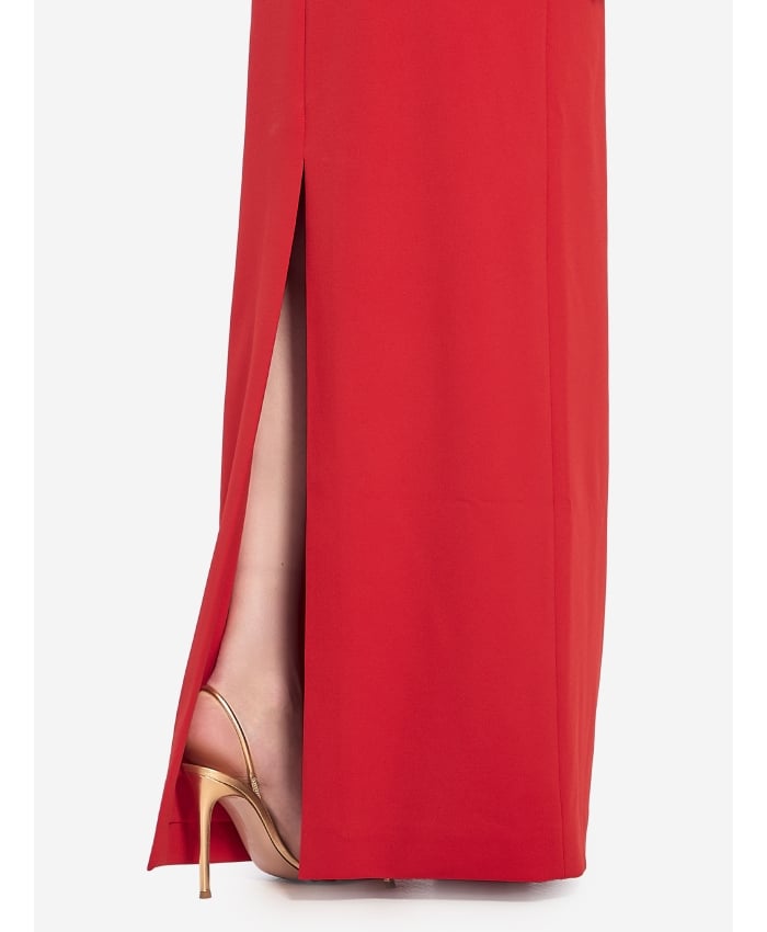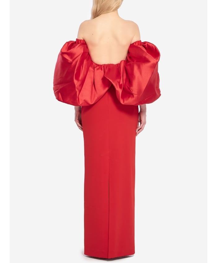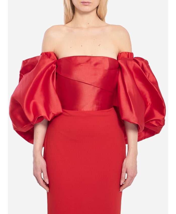 Floris long dress in red polyester. It features an off-the-shoulder design, a glossy pleated bodice, three-quarter-length puff sleeves, an open back,