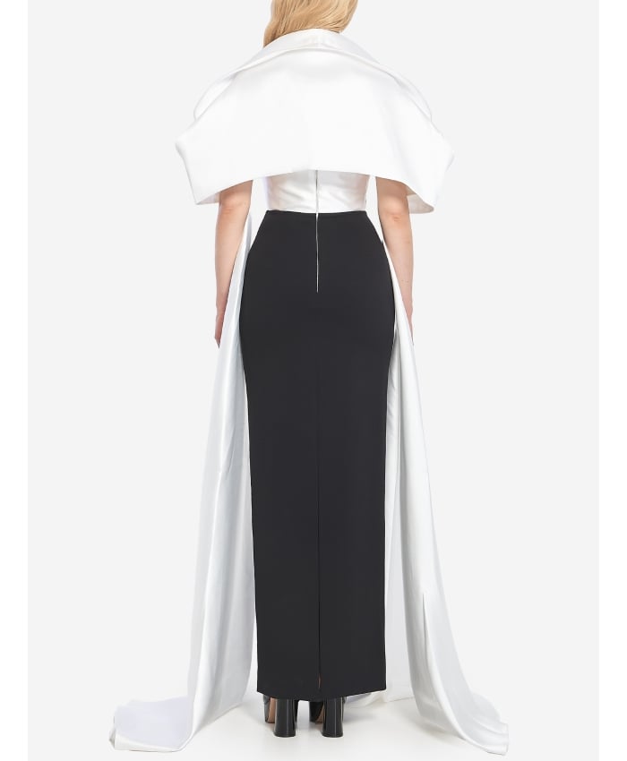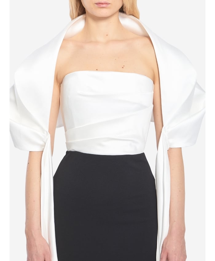 Vera long sleeveless dress with a stole in glossy white polyester and opaque black polyester. It features a white strapless bodice with diagonal