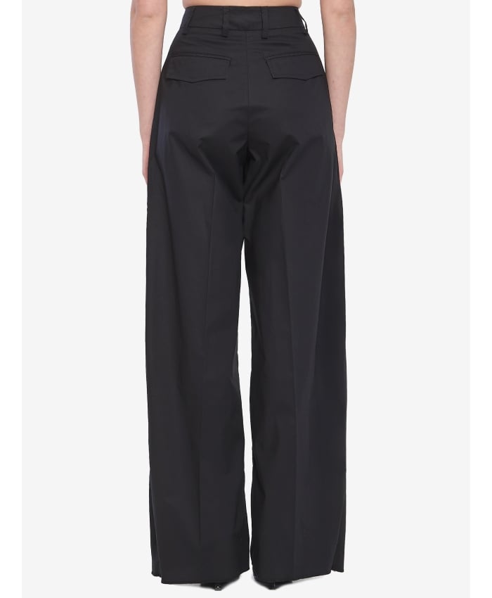 Billie trousers in black cotton blend. They feature a closure with hooks, button, and zip, belt loops, front pleats, two side pockets, two flap