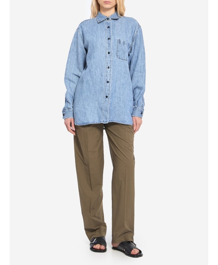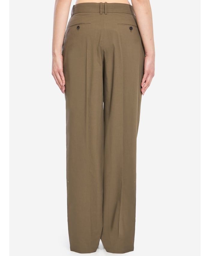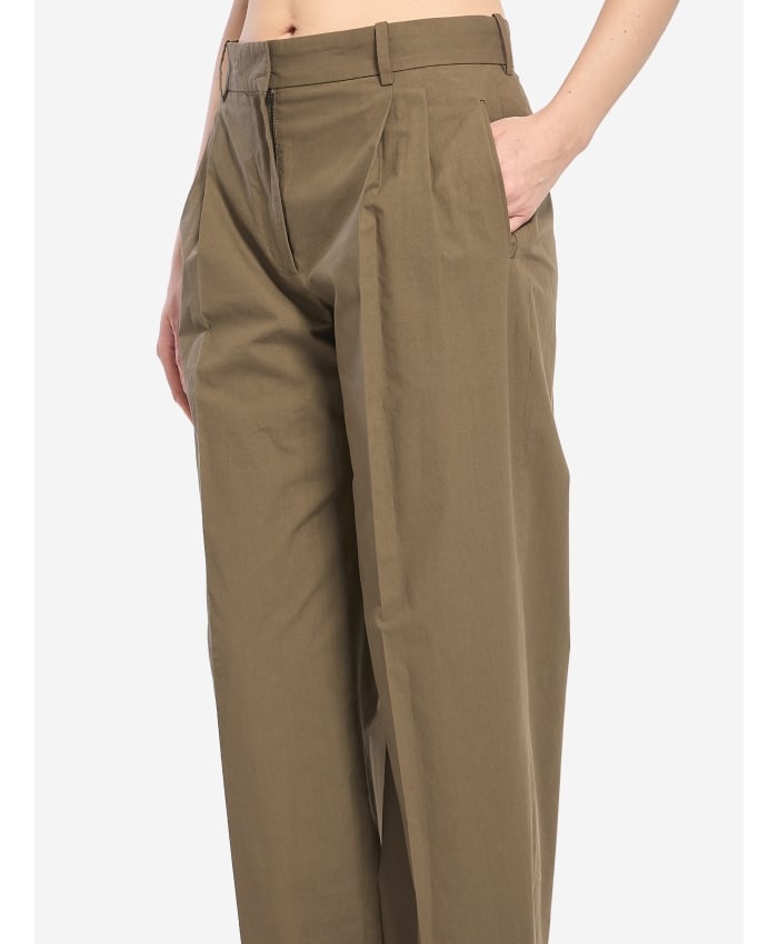 Lilas high-waisted trousers in heavy cotton poplin in khaki. They feature a closure with hooks, button, and zip, front pleats, two side pockets, two