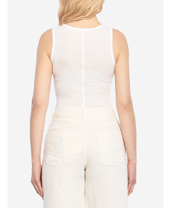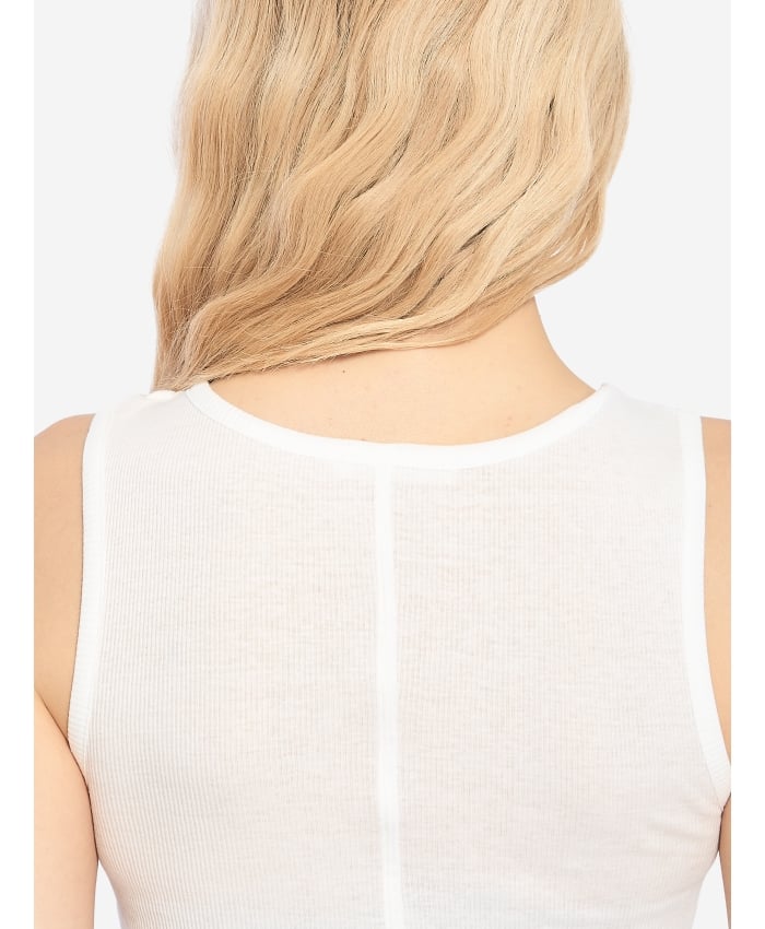 Mansel ribbed jersey white tank top. It features a round neckline, a placket with five snap buttons, and a stitching detail at the back.The model is