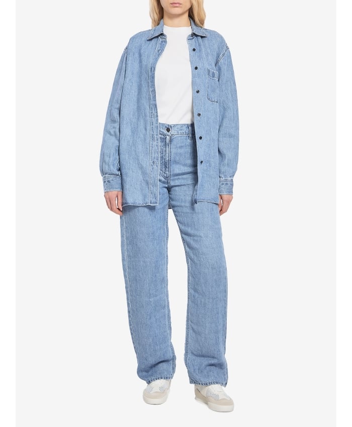 Tarley mid-rise jeans in soft blue linen denim. They feature a button and zip closure, five pockets, belt loops, and straight legs.The model is 178cm