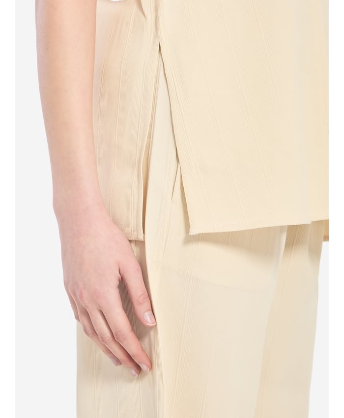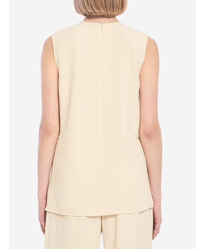 Sleeveless top in a viscose and linen blend ribbed knit in ecru. It features a crew neckline, side slits at the hem, and a hidden zip closure at the