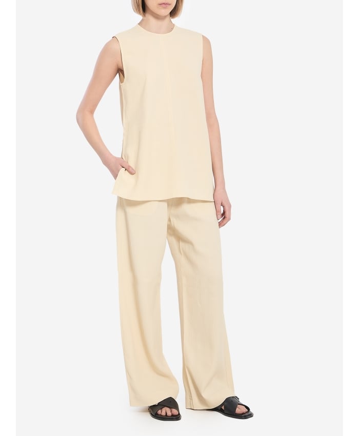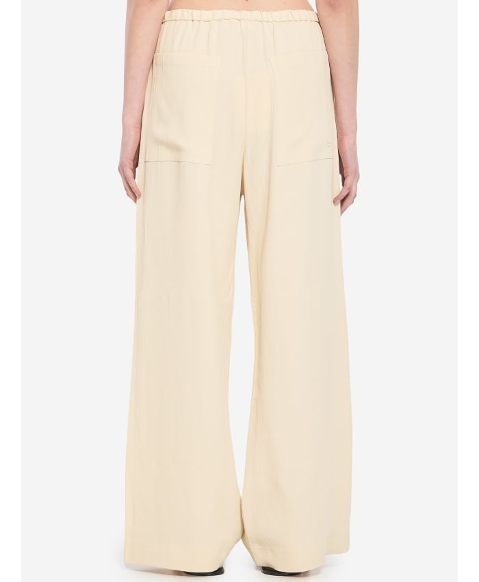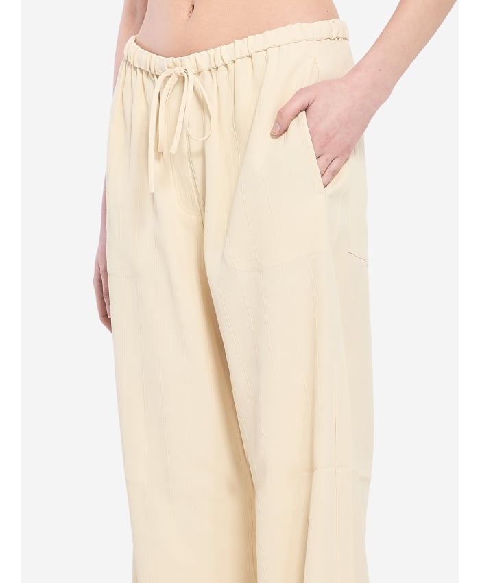 Ribbed ecru trousers made of a viscose-linen blend knit. They feature an elastic waistband with drawstring, two side pockets, two back pockets, and