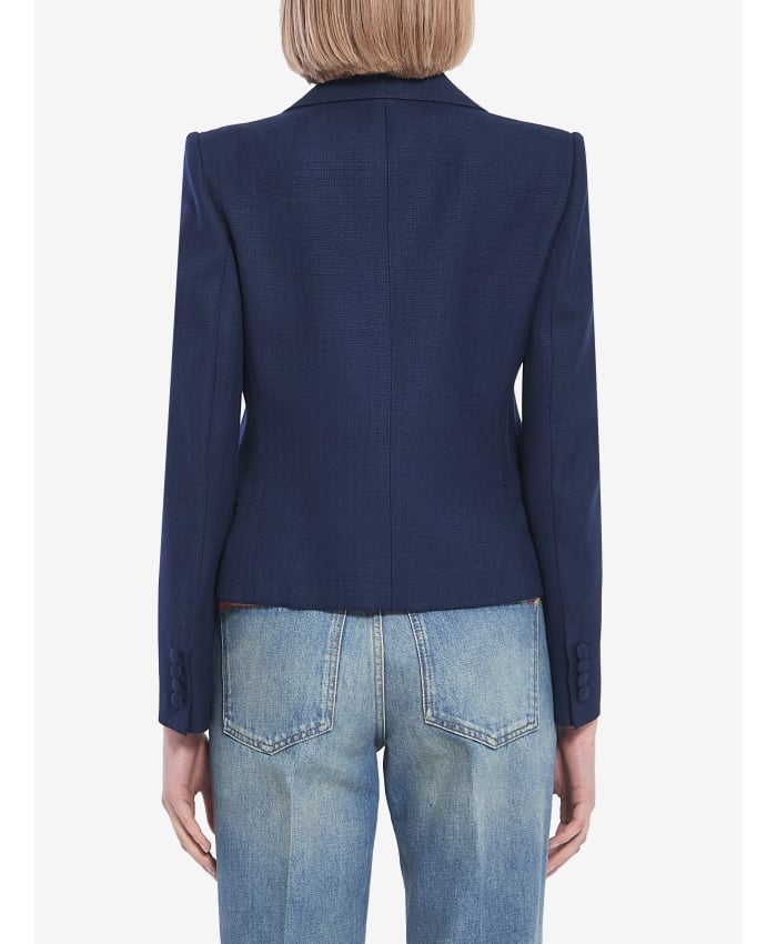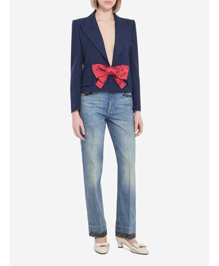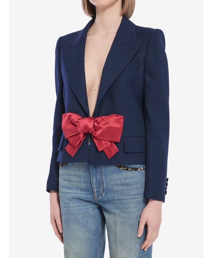 Dark blue double duchesse viscose jacket. It features peak lapels, a front closure with a bow and snap buttons, two front flap pockets, cuffs with