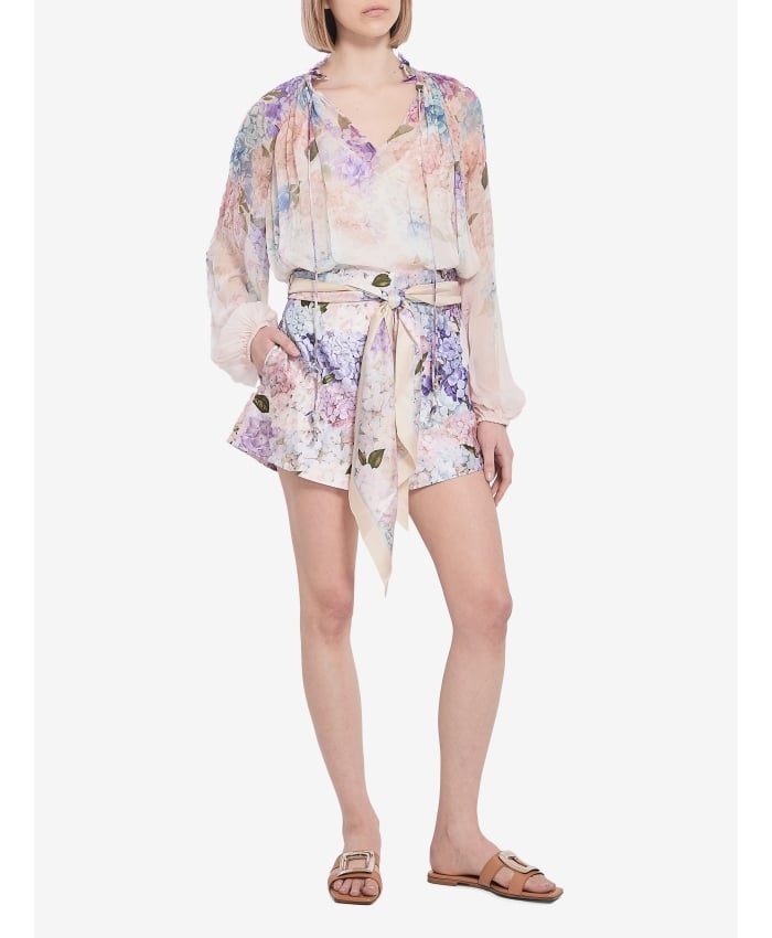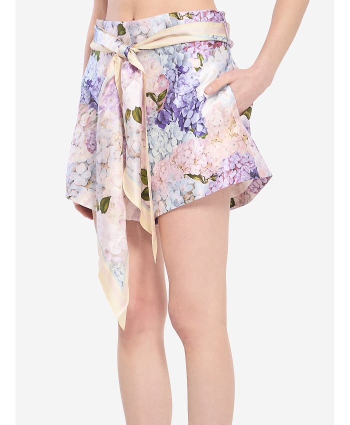 High-waisted Dawning shorts in multicolor hydrangea print silk. They feature a removable scarf belt, belt loops, two side pockets, and a zip closure