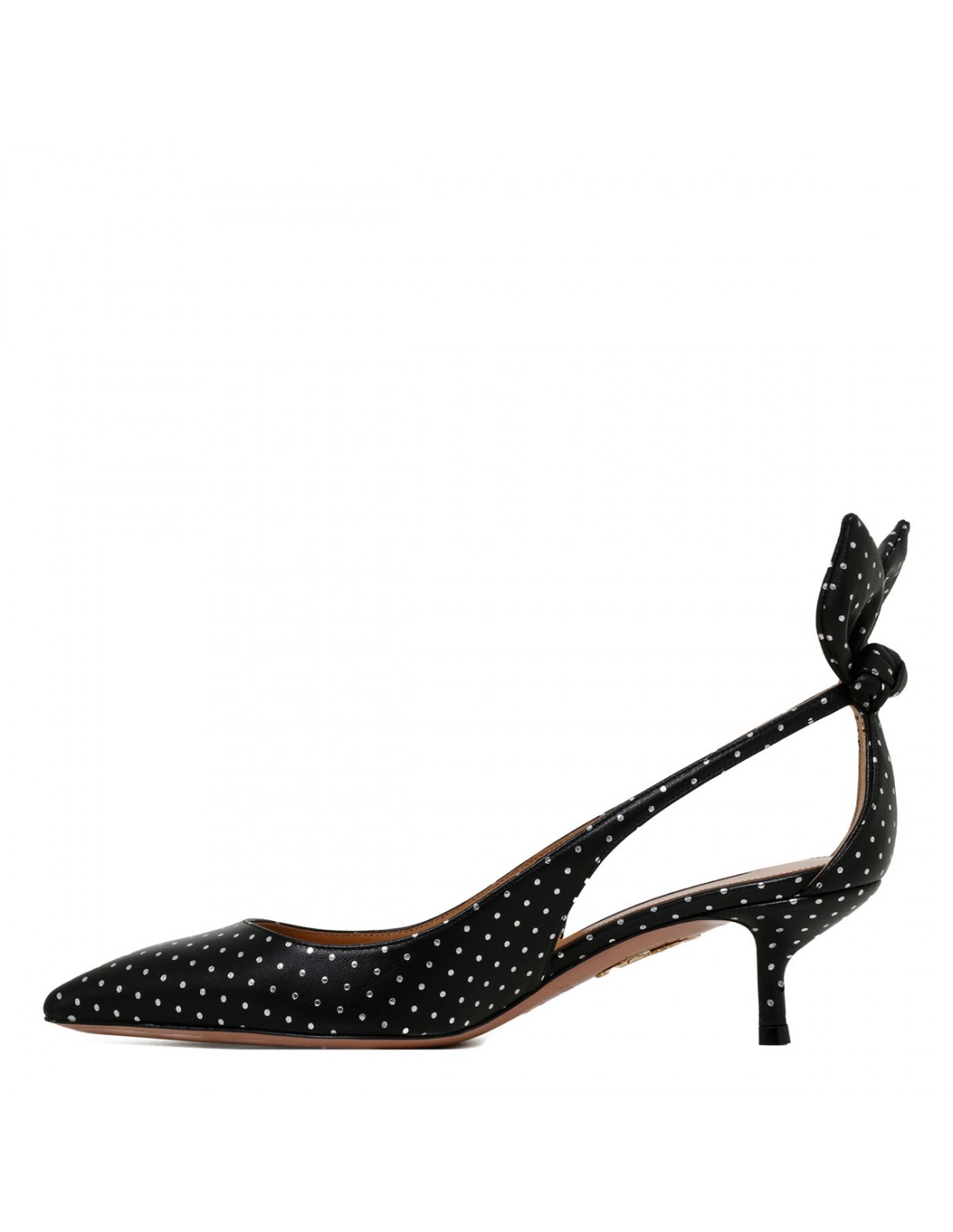 Black smooth leather Bow Tie pumps from Aquazzura featuring silver polka dots, pointed toe, bow at back, side cutouts, 50 slim heel, padded leather insole with Aquazzura logo, leather sole with embossed Pineapple logo.
