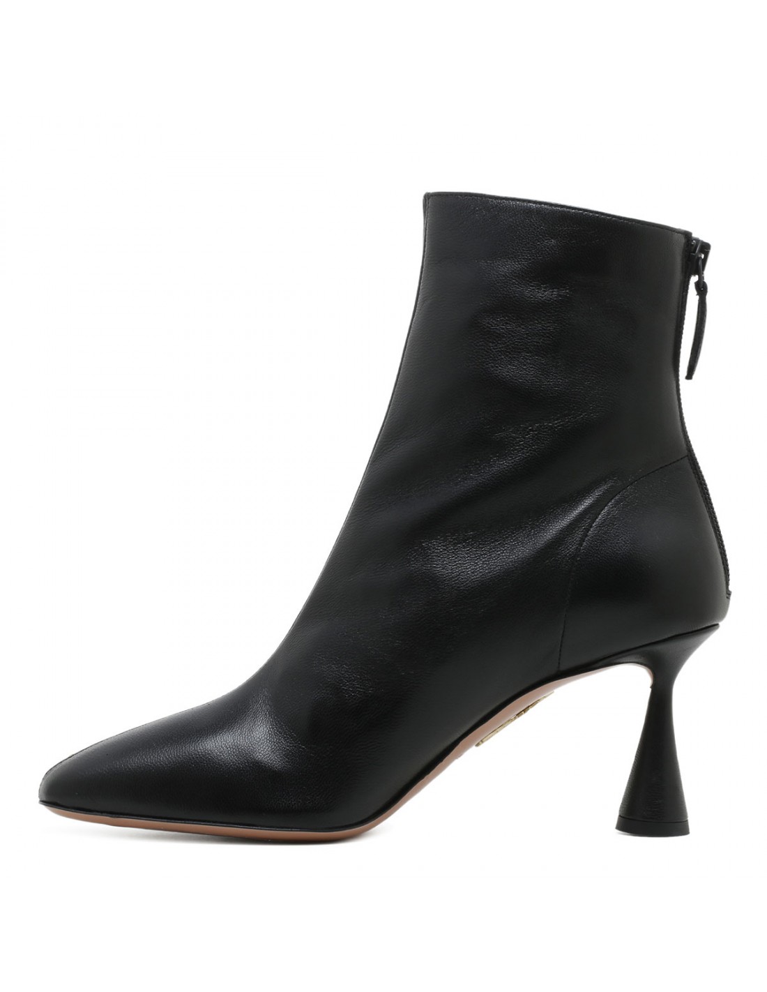 Black leather Amore booties from Aquazzura featuring pointed toe, zip fastening along back, 75 sculptural heel, padded leather insole, leather sole with signature logo detailing.
