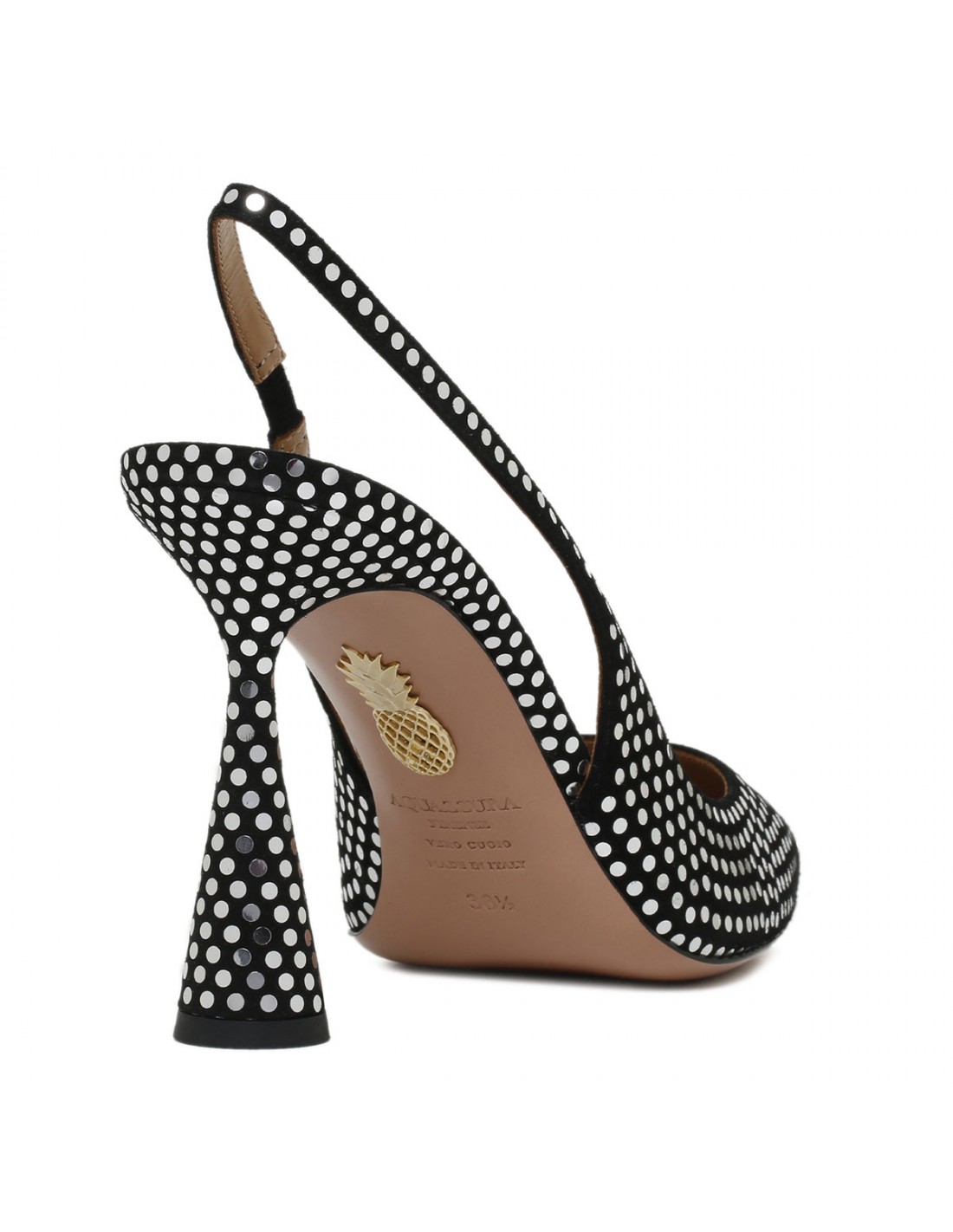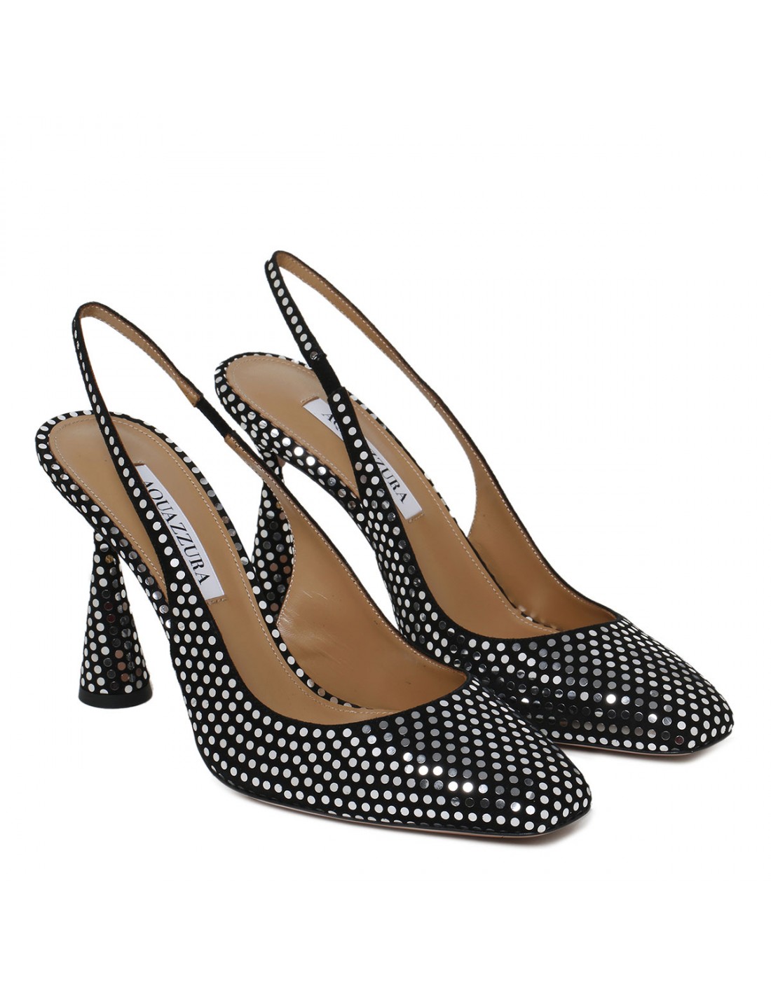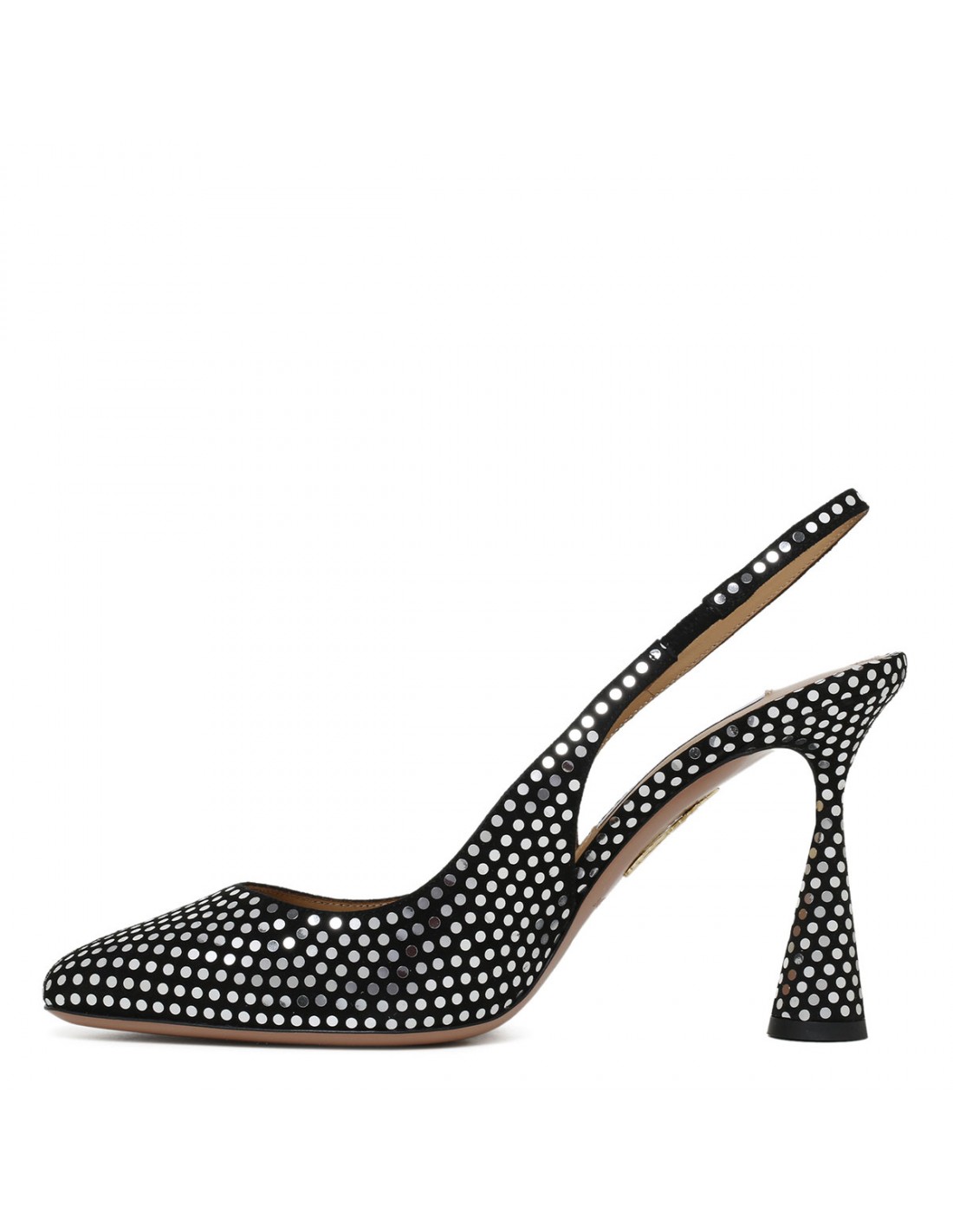 Black leather Amore slingback pumps from Aquazzura featuring silver-tone metal studs, squared toe, slingback strap with elastic insert, 95 sculptural heel, padded leather insole, leather sole with signature logo detailing.