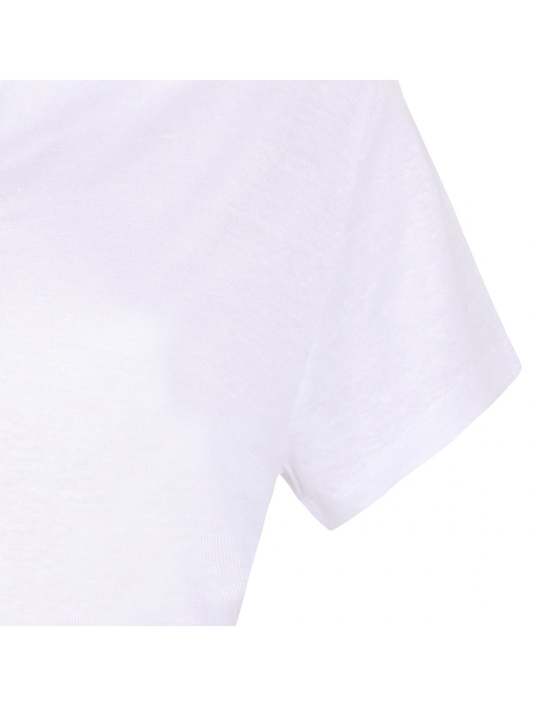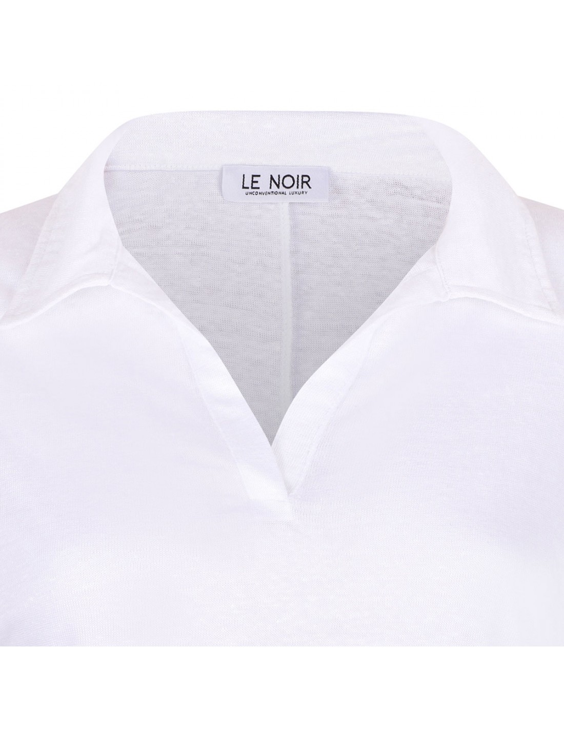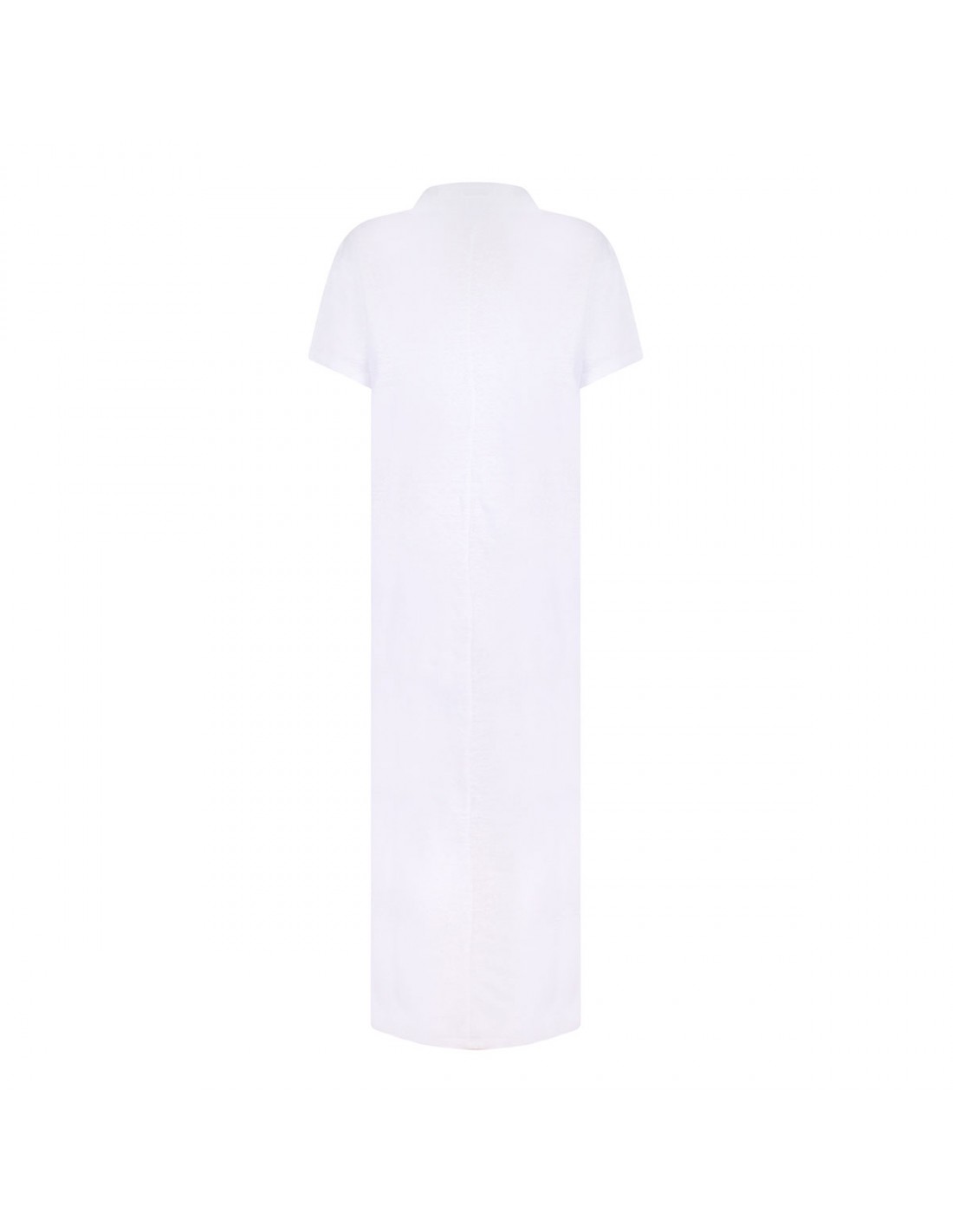 Pure white linen Orian dress from Le Noir featuring pointed collar with small V-neck, maxi length, short sleeves, straight silhouette.