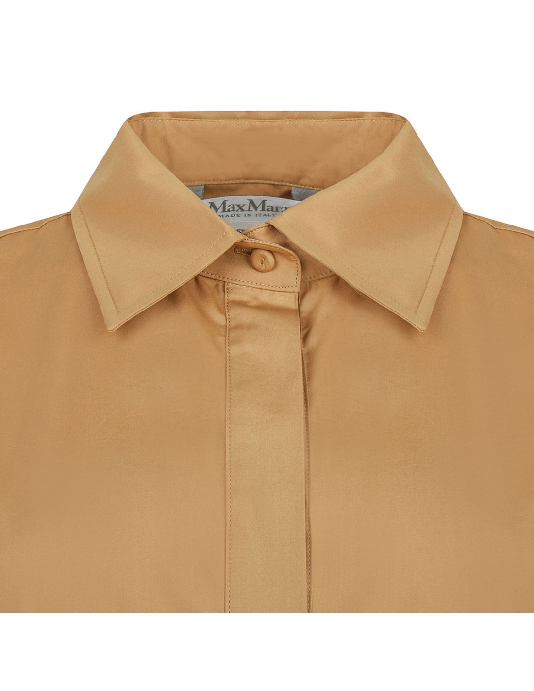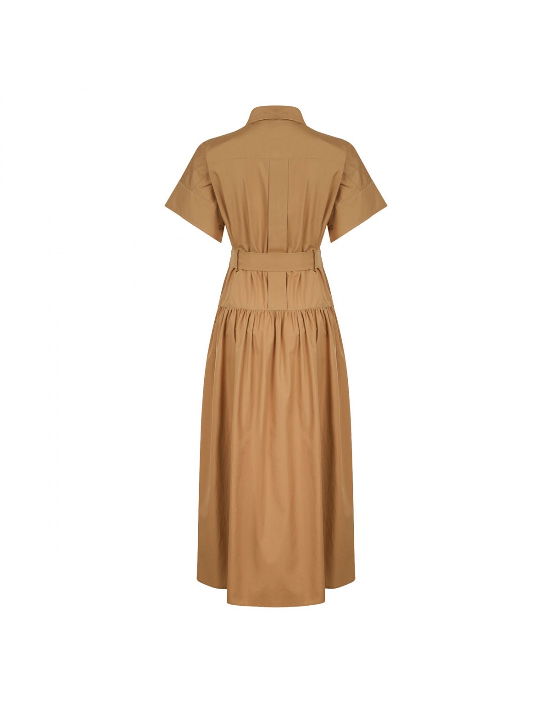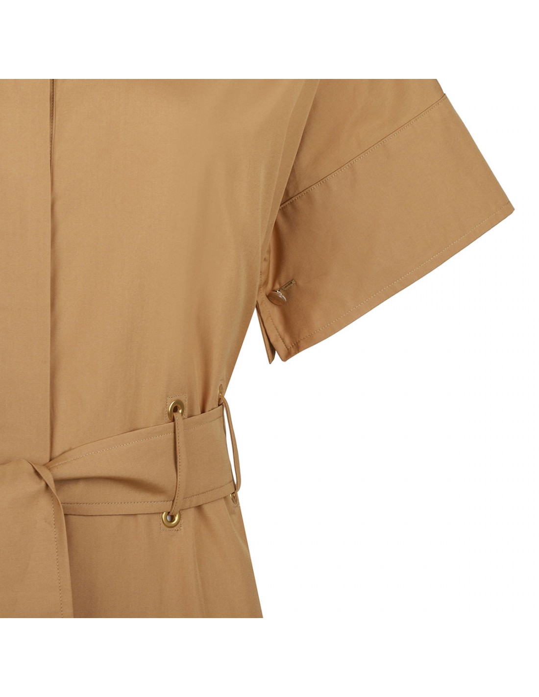 Caramel hue pure cotton poplin Agoraio shirt dress from Max Mara featuring flared style, shirt collar, short kimono sleeves with buttoned hem, self-tie matching belt, yoke cut and pleat at back, metal eyelets, concealed button fastening at front.
