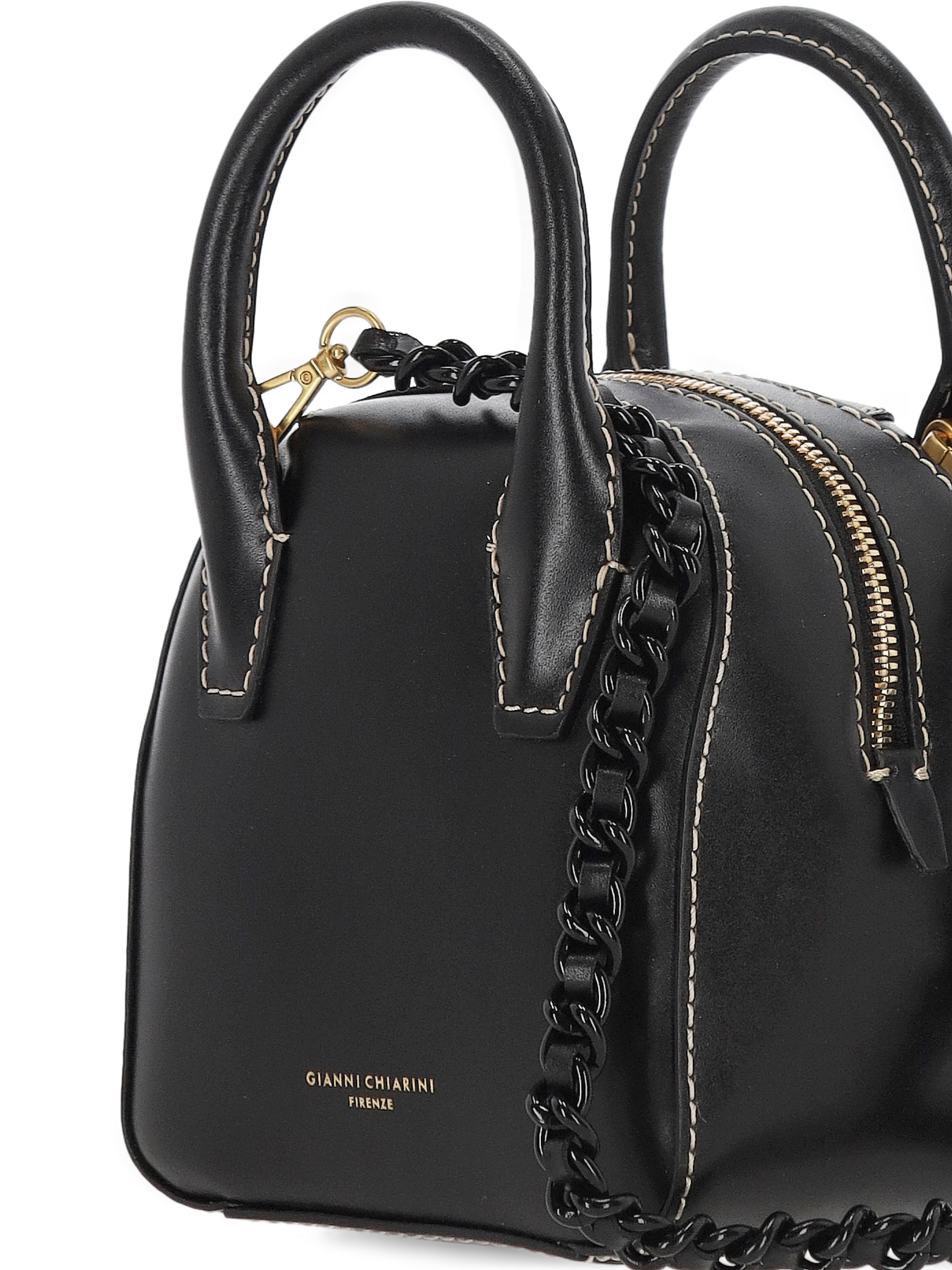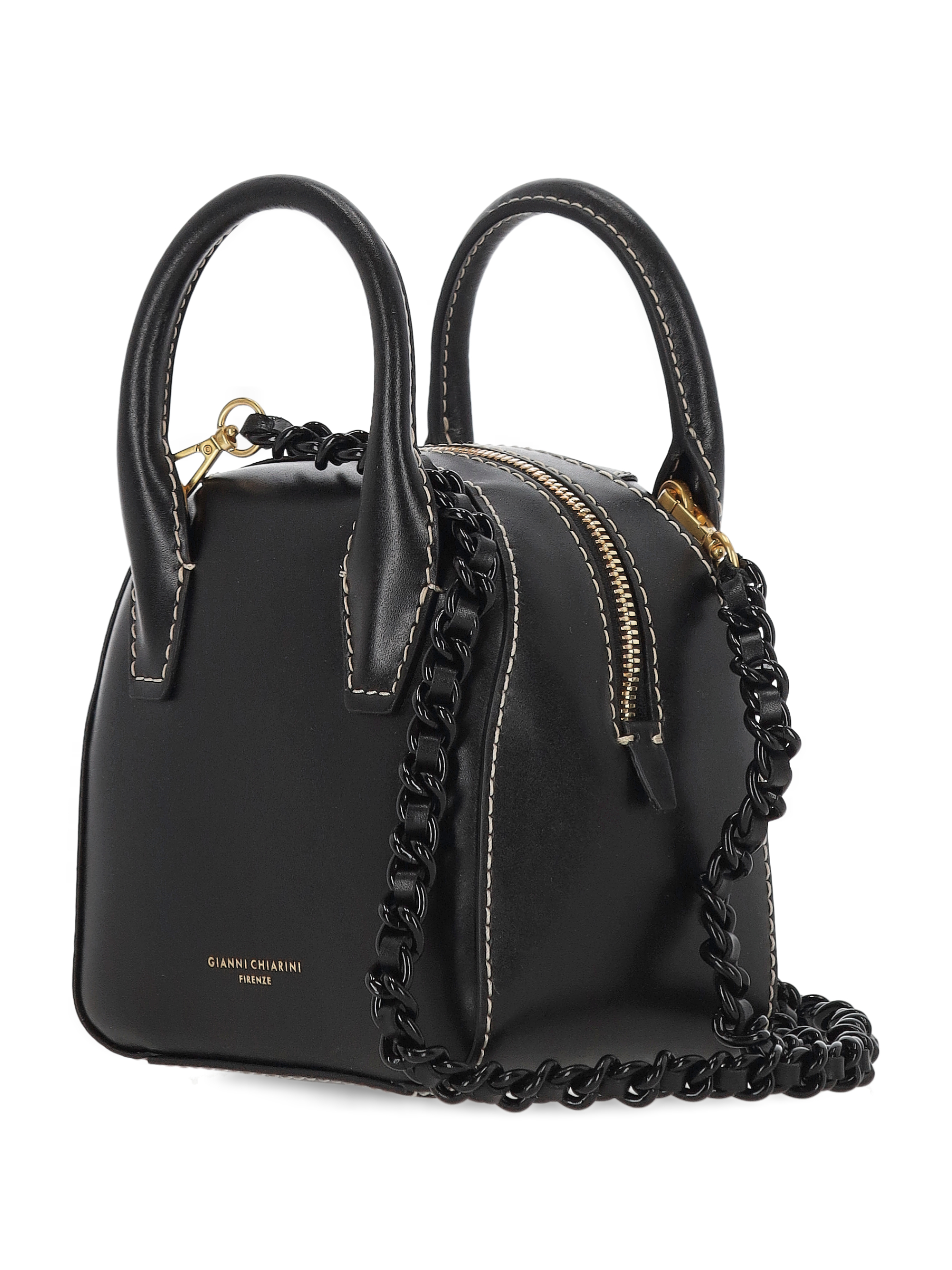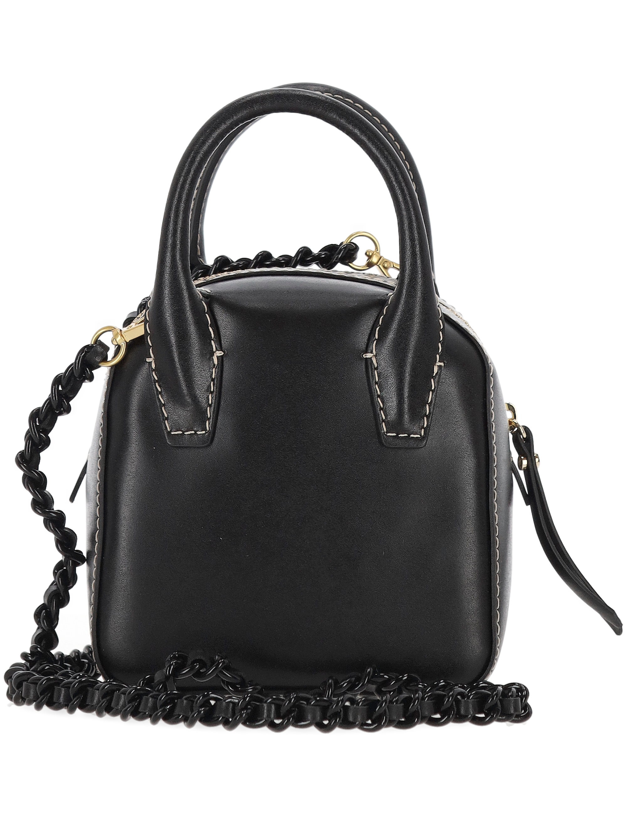 black top zip fastening two rolled top handles detachable chainlink shoulder strap This piece comes complete with a protective dust bag