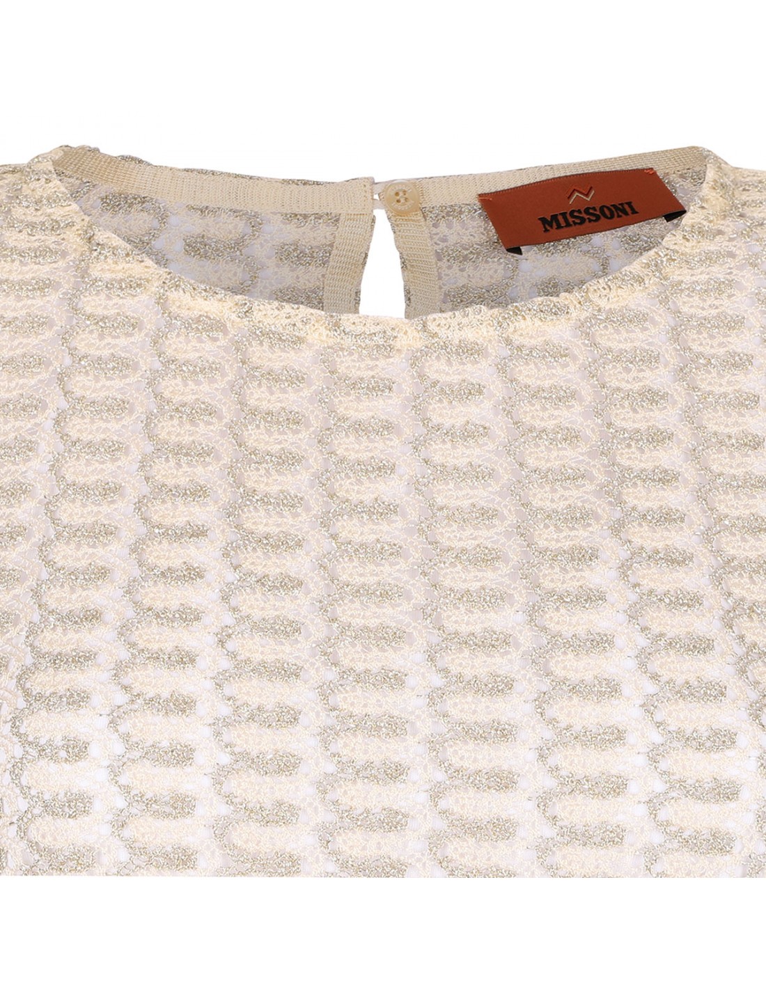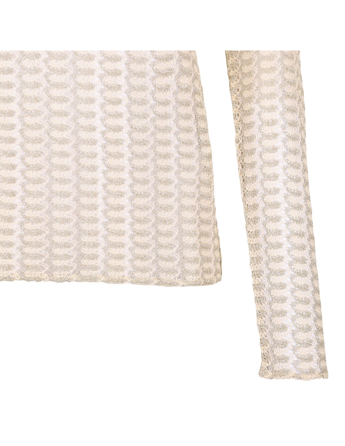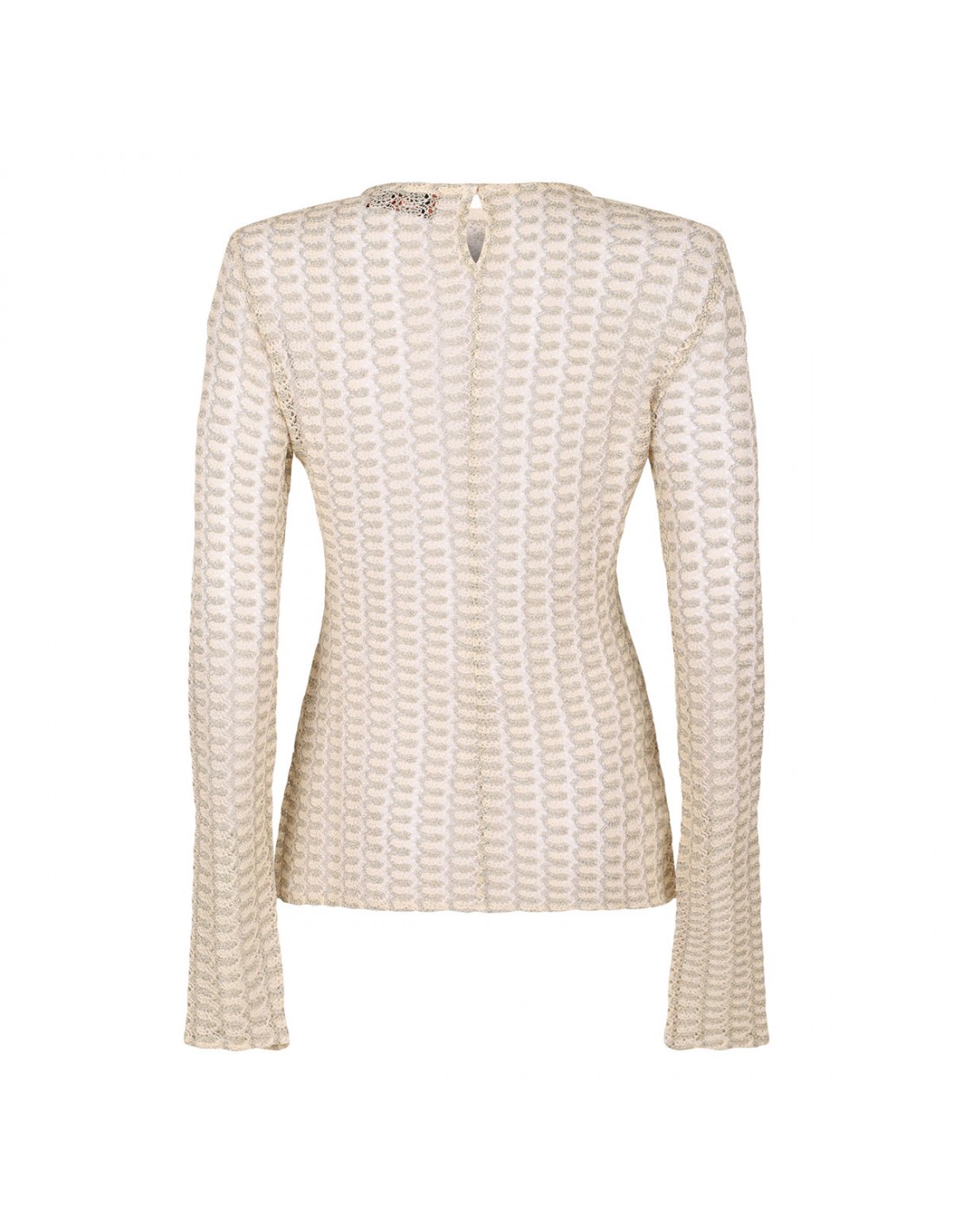 Gold and cream knit viscose sweater from Missoni featuring lame filaments, crew collar, back keyhole with button closure, long sleeves with elongated cuffs.