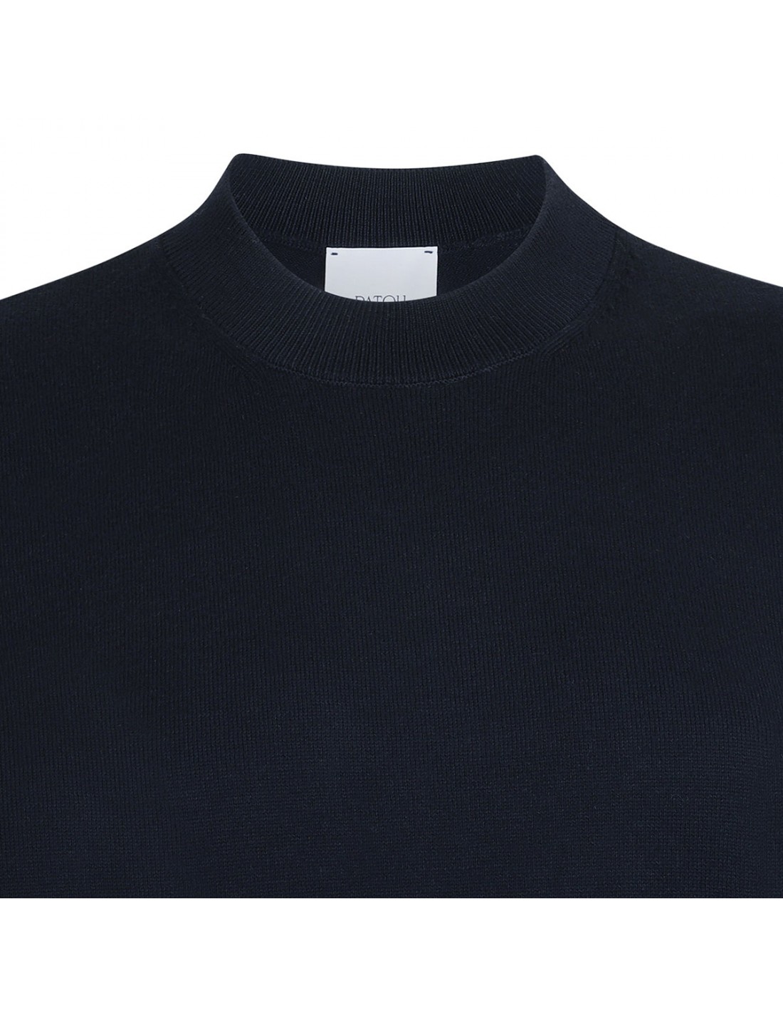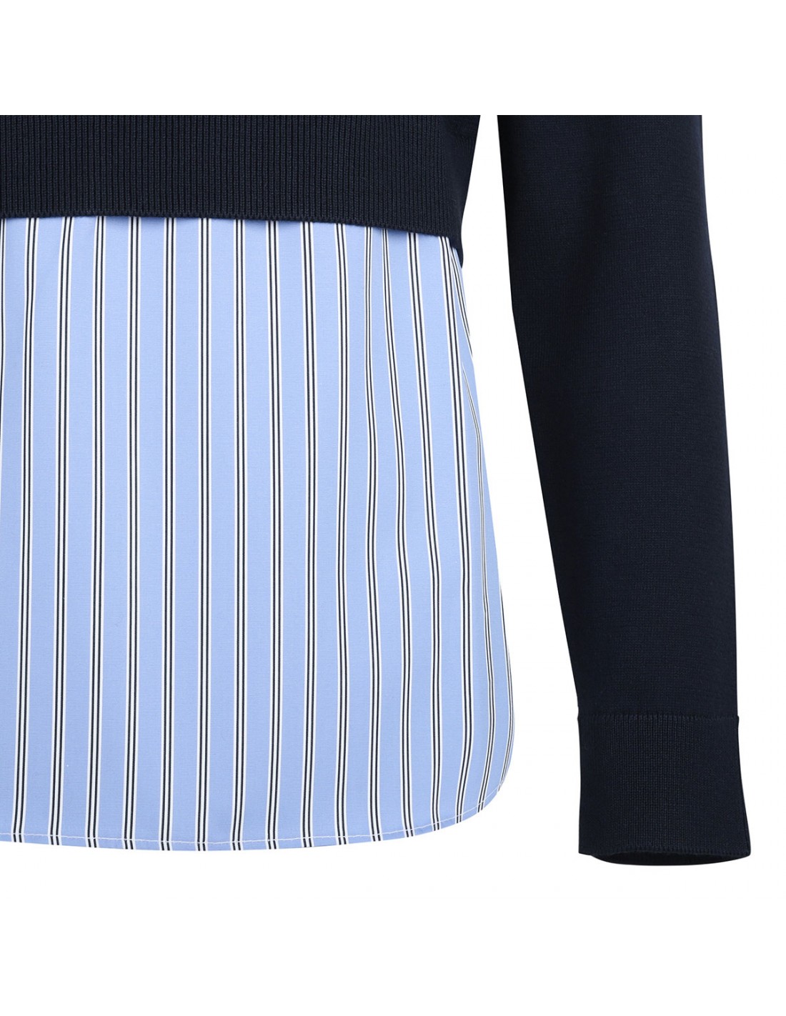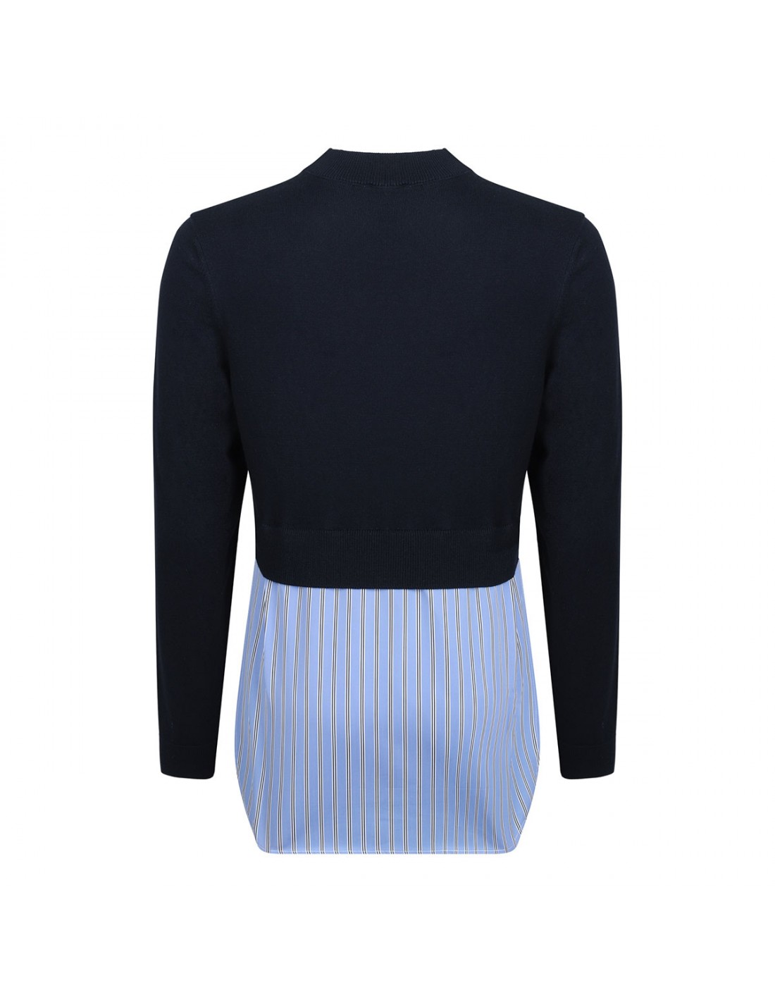 Navy black cotton jumper from Patou featuring hybrid trompe l'œil construction with striped poplin hem, mock neck, long sleeves, ribbed collar, cuffs and hem.