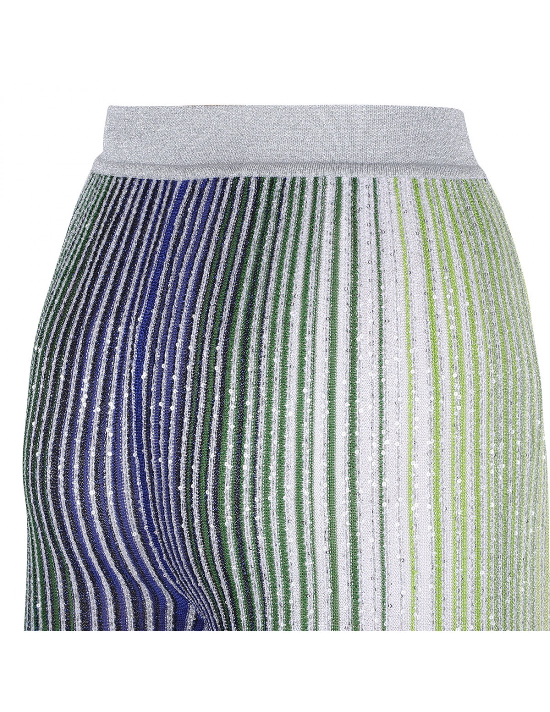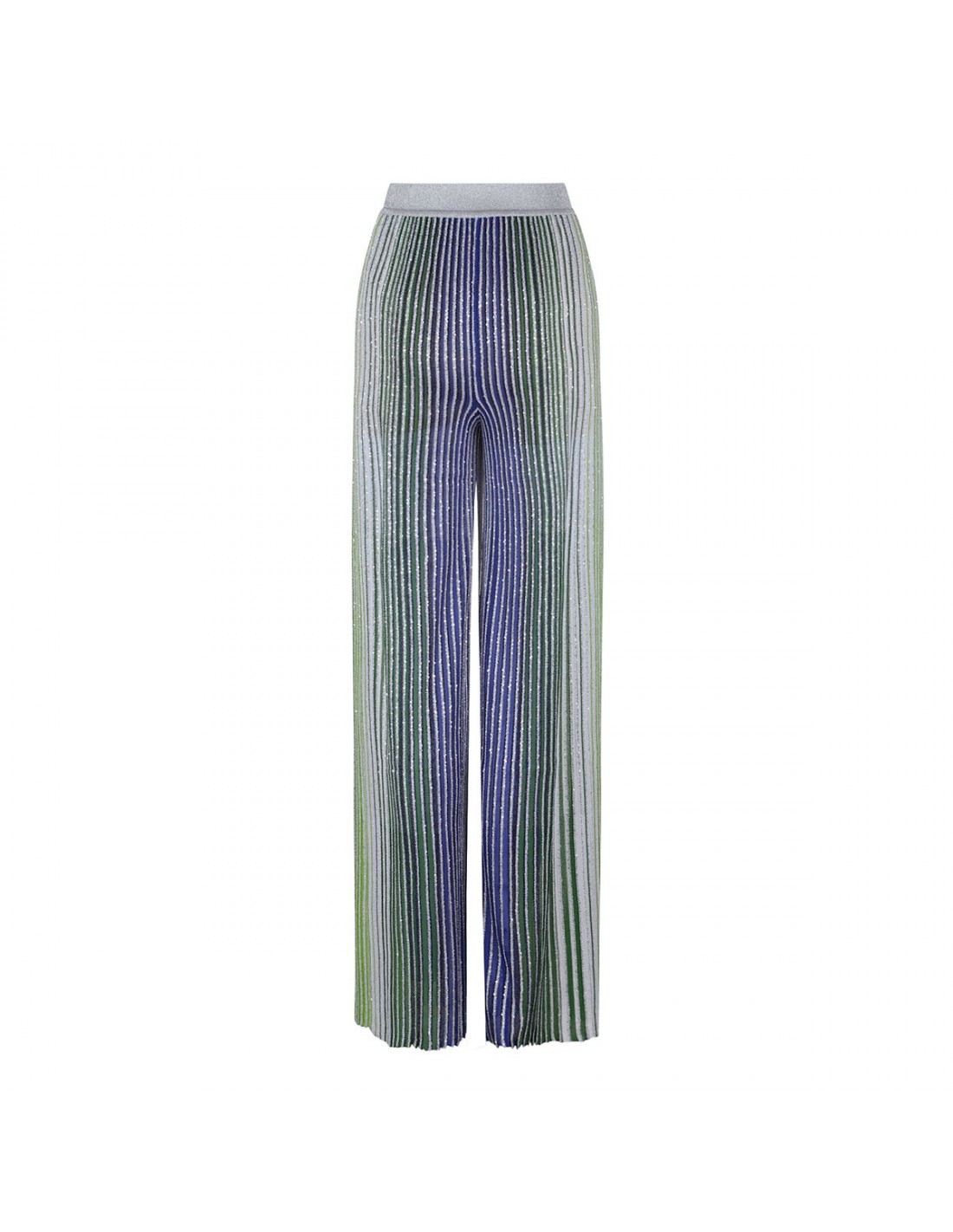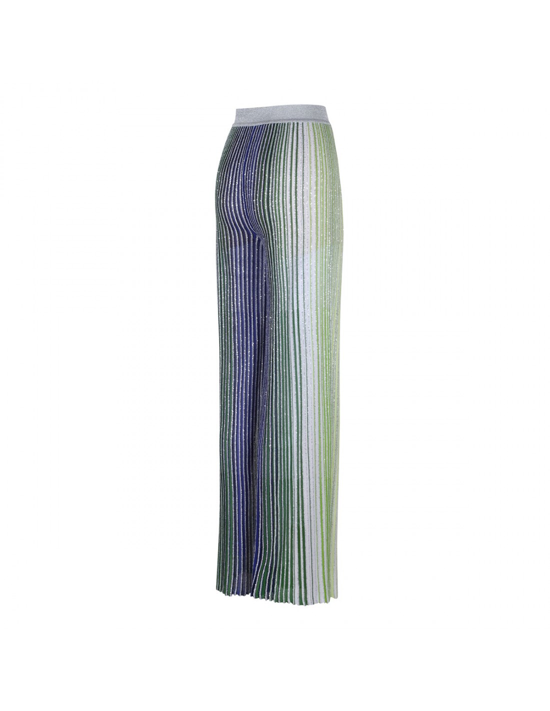 Green, white and blue knit viscose palazzo pants from Missoni featuring striped motif with bright sequins and lame filaments, wide leg, fluid silhouette, elastic waist.