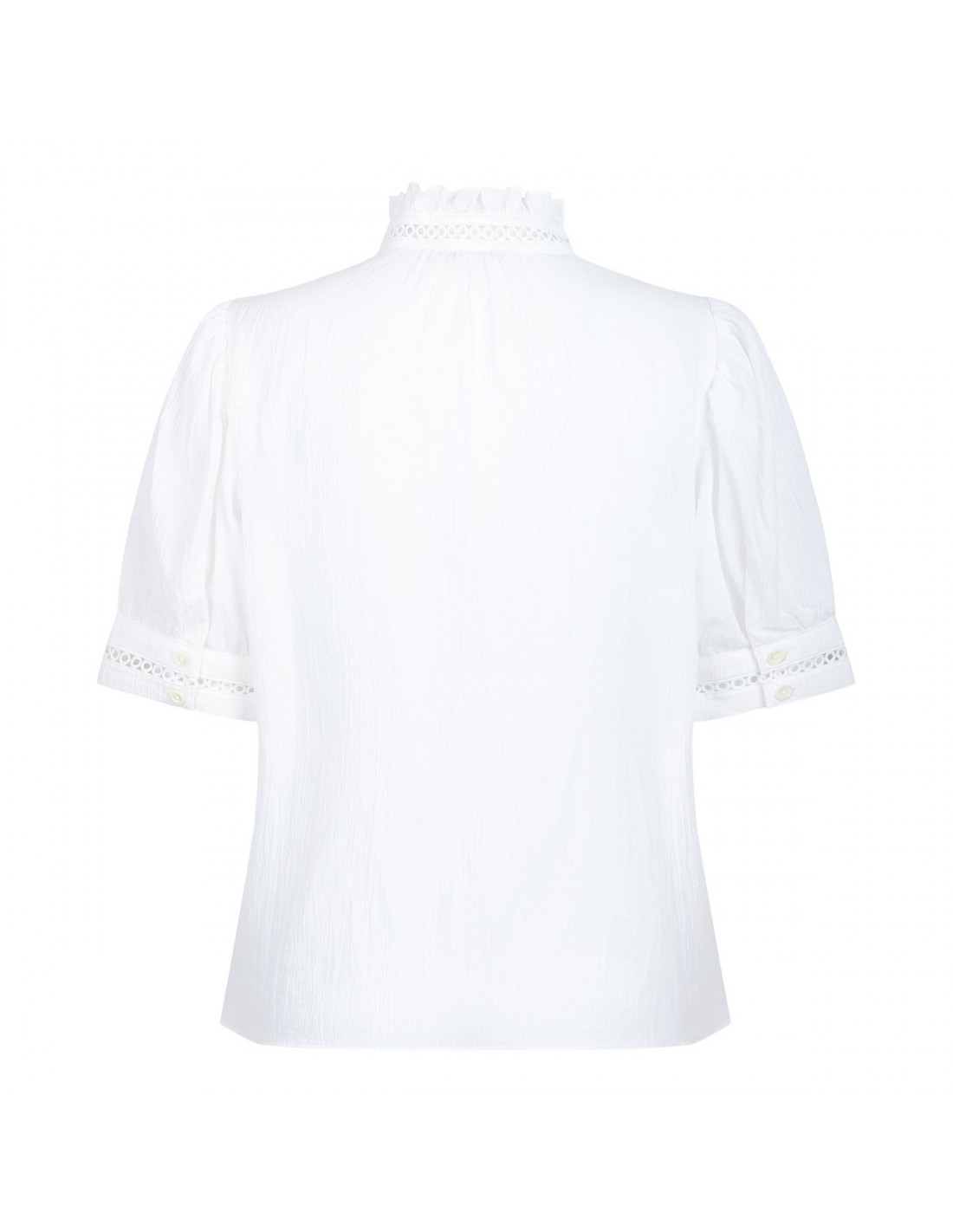 White cotton The Ruffle Collar top from Frame featuring half-button placket, ruffle high collar, eyelet broderie detail to the neckline and sleeves, short sleeves, regular fit, gathering to shoulders.