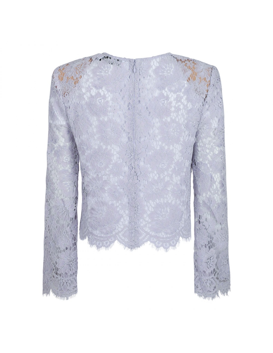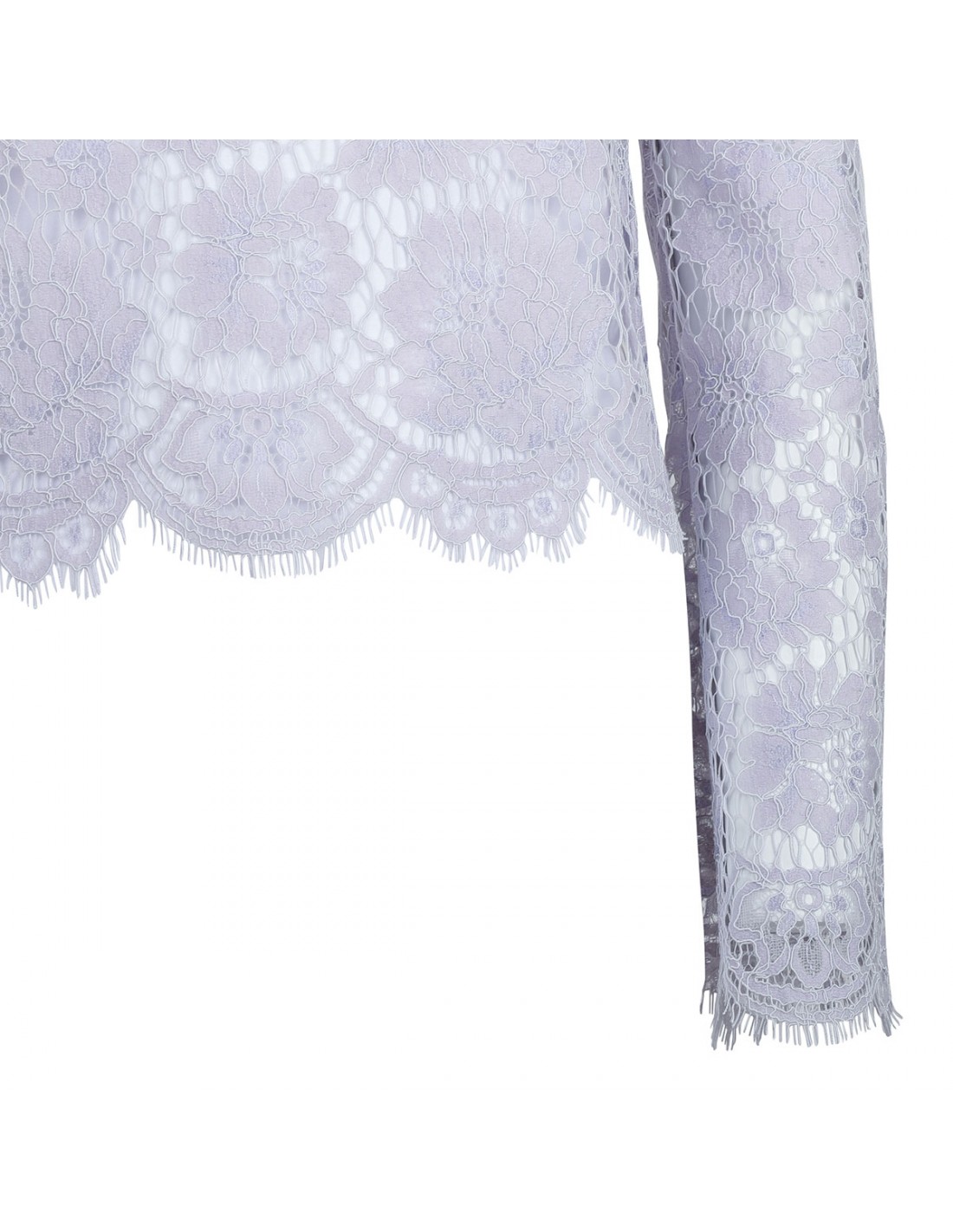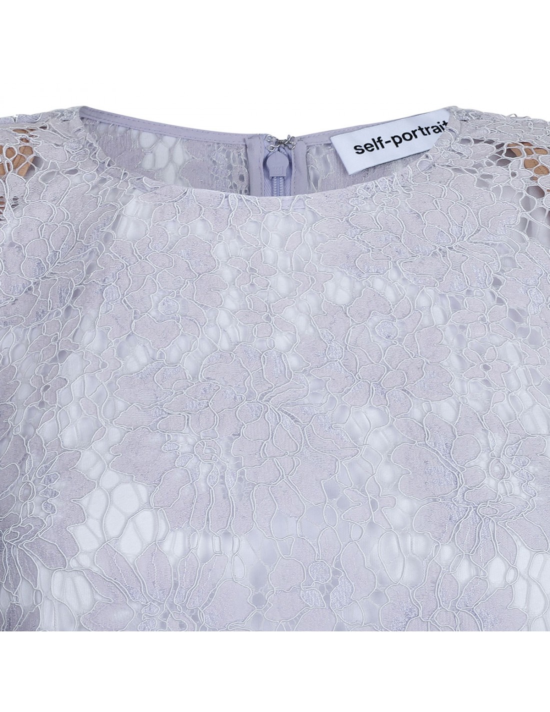 Lilac lace top from Self Portrait featuring fluted long sleeves, relaxed fit, round neckline, zip closure at back, unlined style.