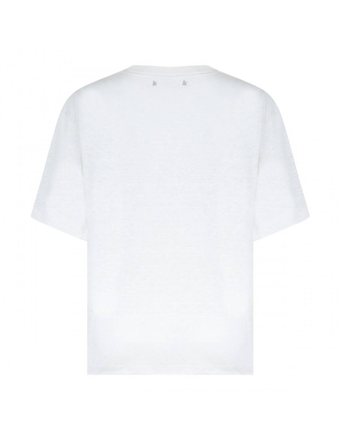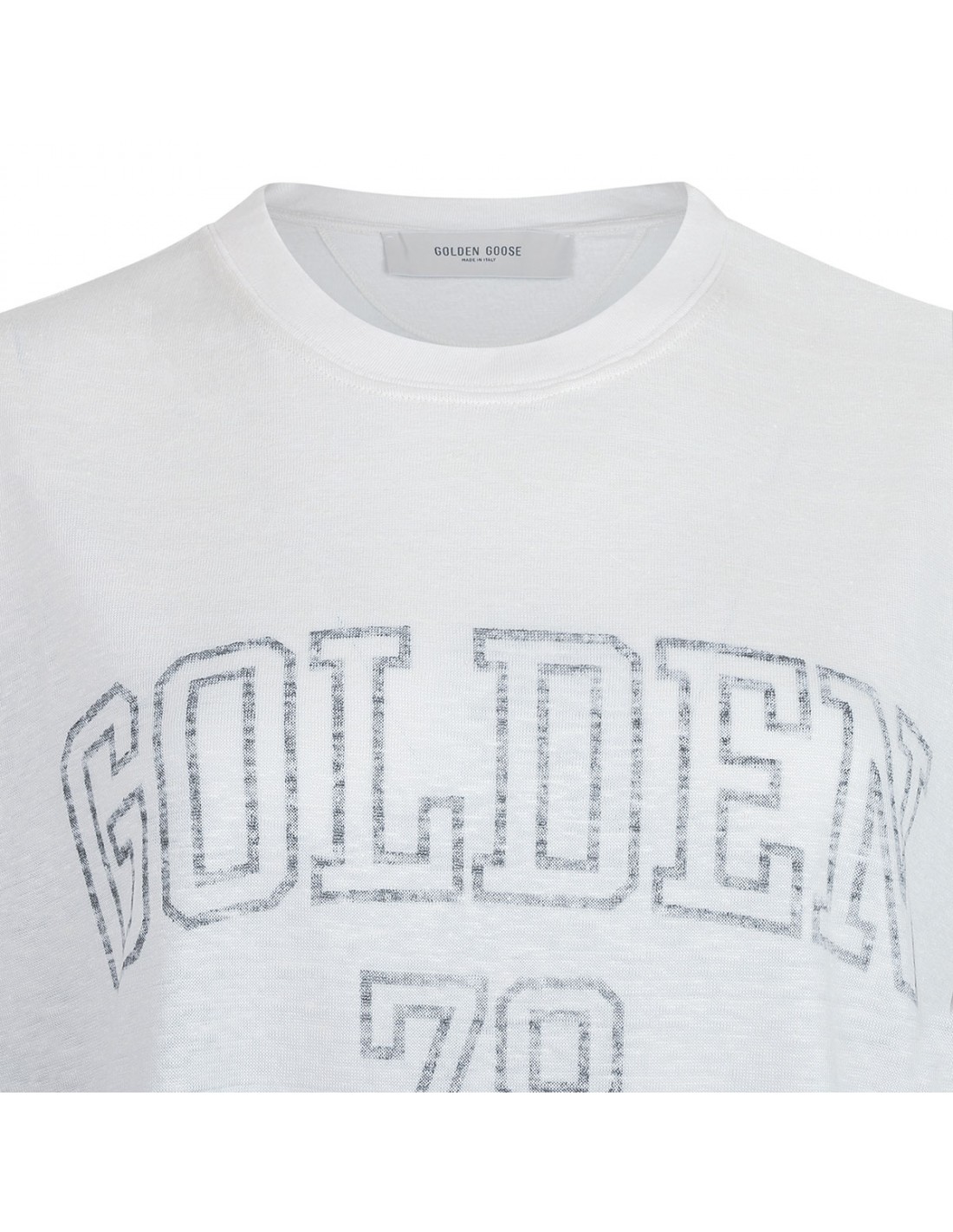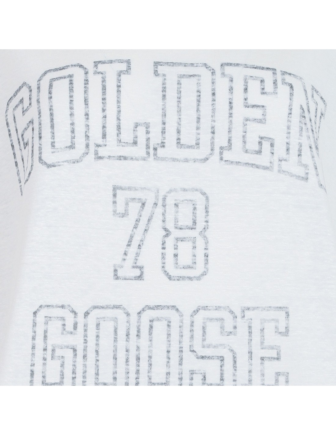 Vintage white lightweight linen jersey T-shirt from Golden Goose featuring logo print on front, shirt sleeves, ribbed knit crew collar.