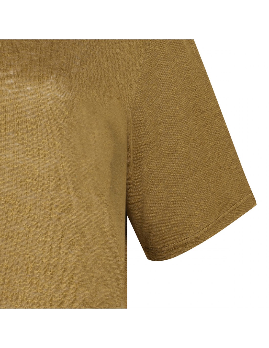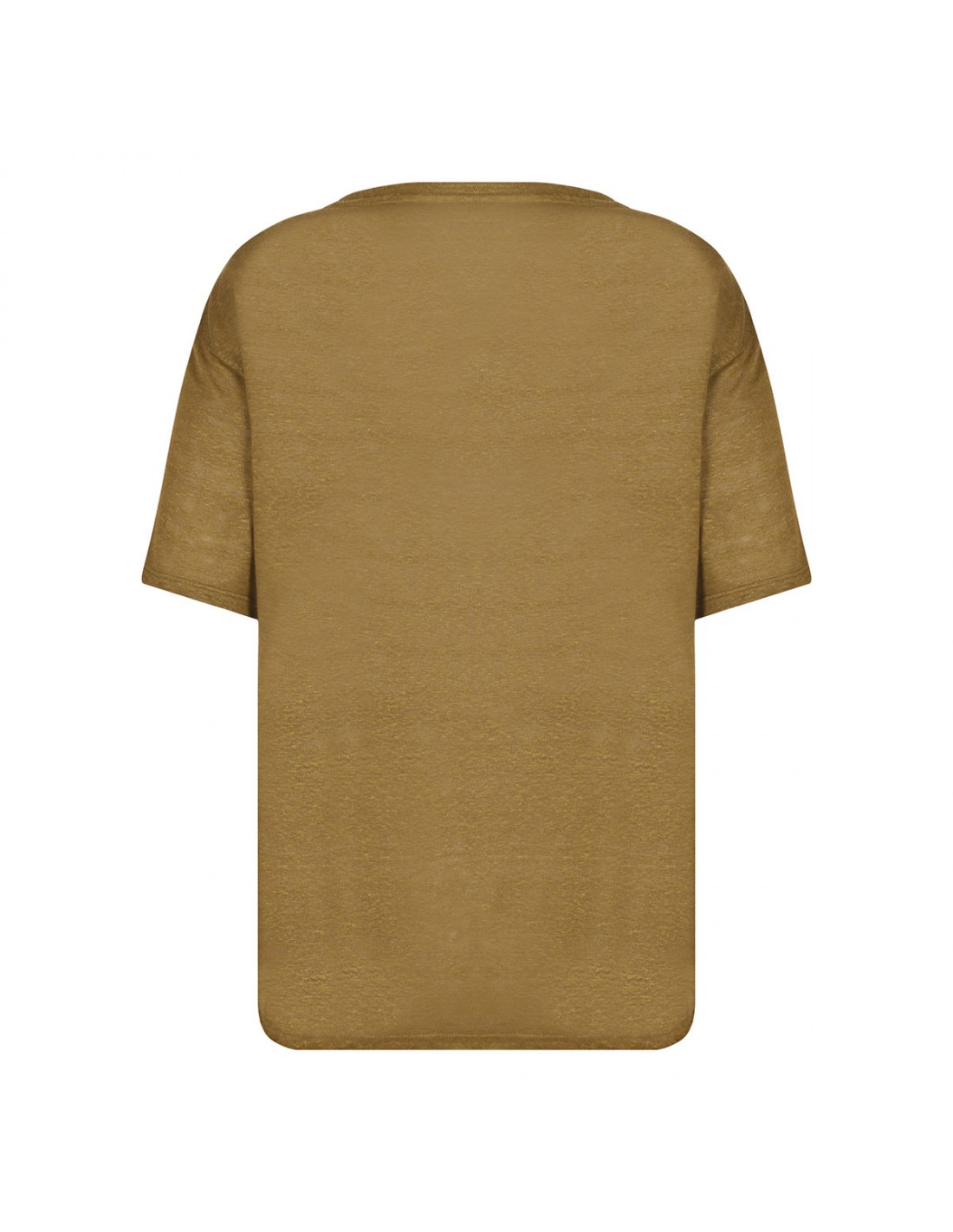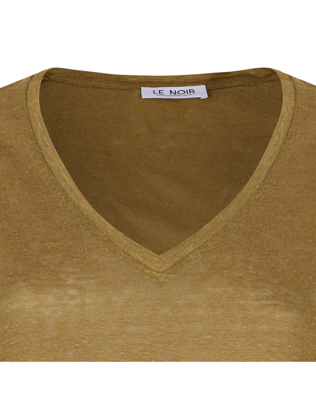 Military green linen Jaya T-shirt from Le Noir featuring dropped shoulders, short sleeves, small V neckline.