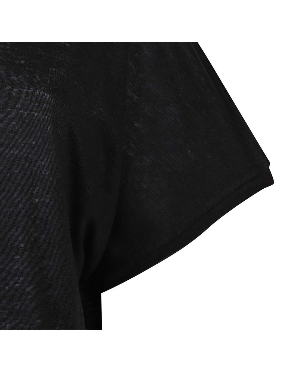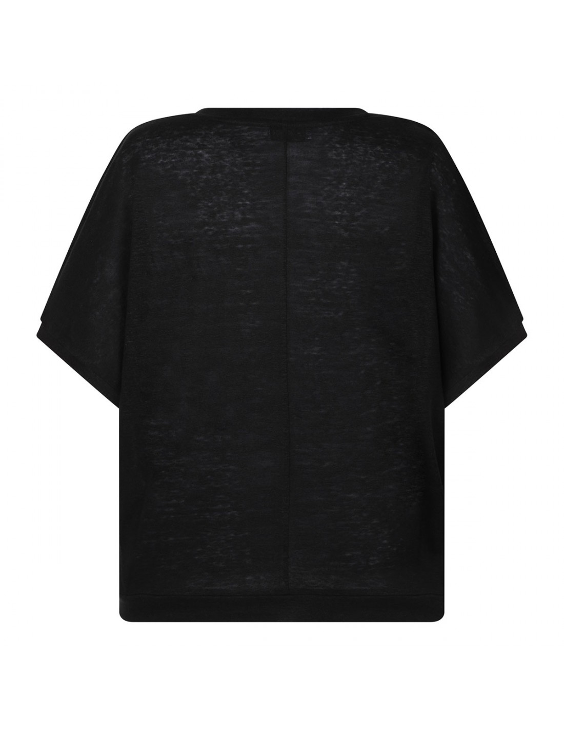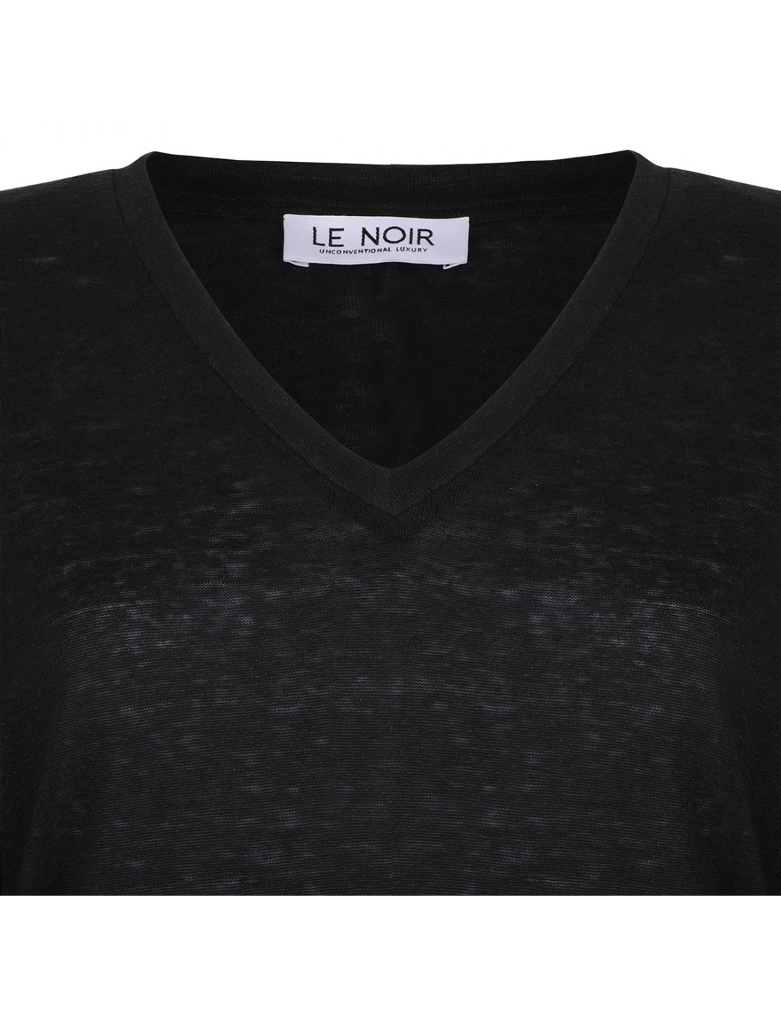 Black linen Jaya T-shirt from Le Noir featuring boxy silhouette, dropped shoulders, short sleeves, small V neckline.