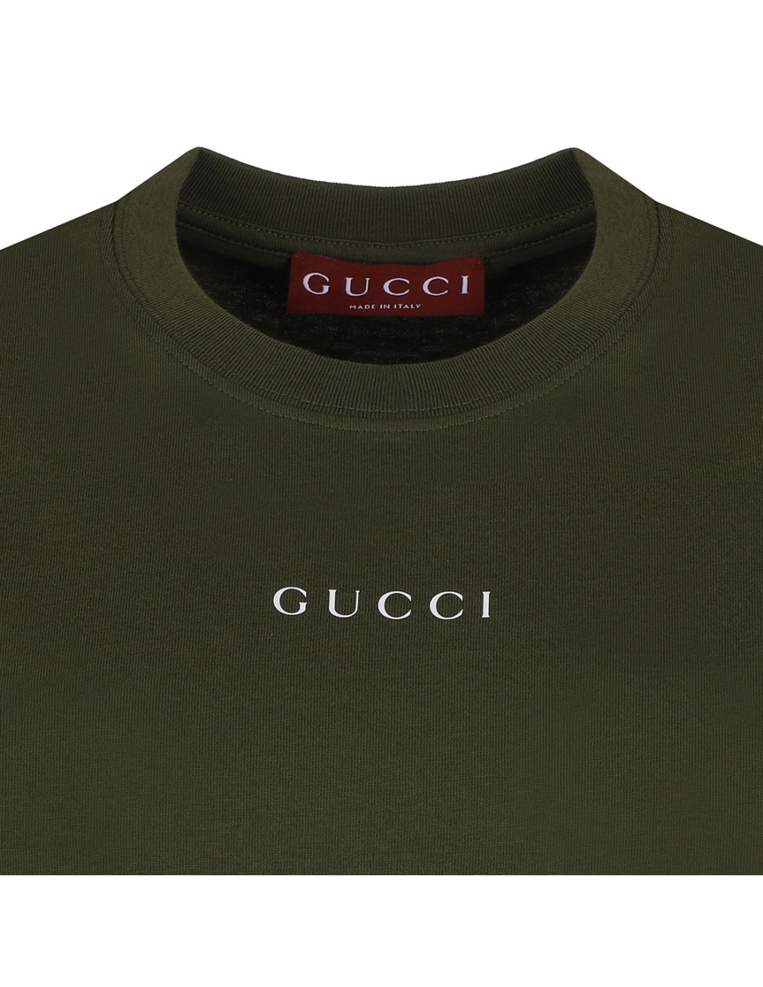 Forest green medium cotton jersey T-shirt from Gucci featuring logo print detail, dropped shoulders, crewneck, short sleeves, regular fit, rib trims.