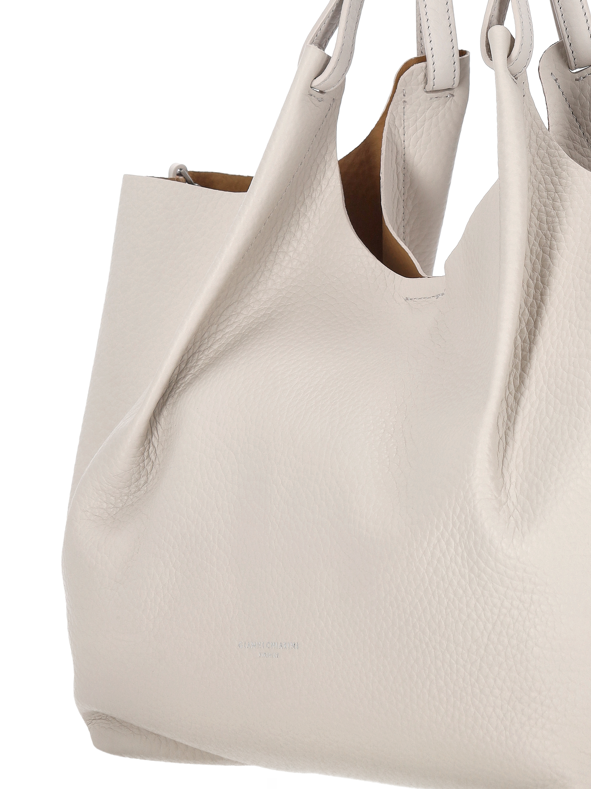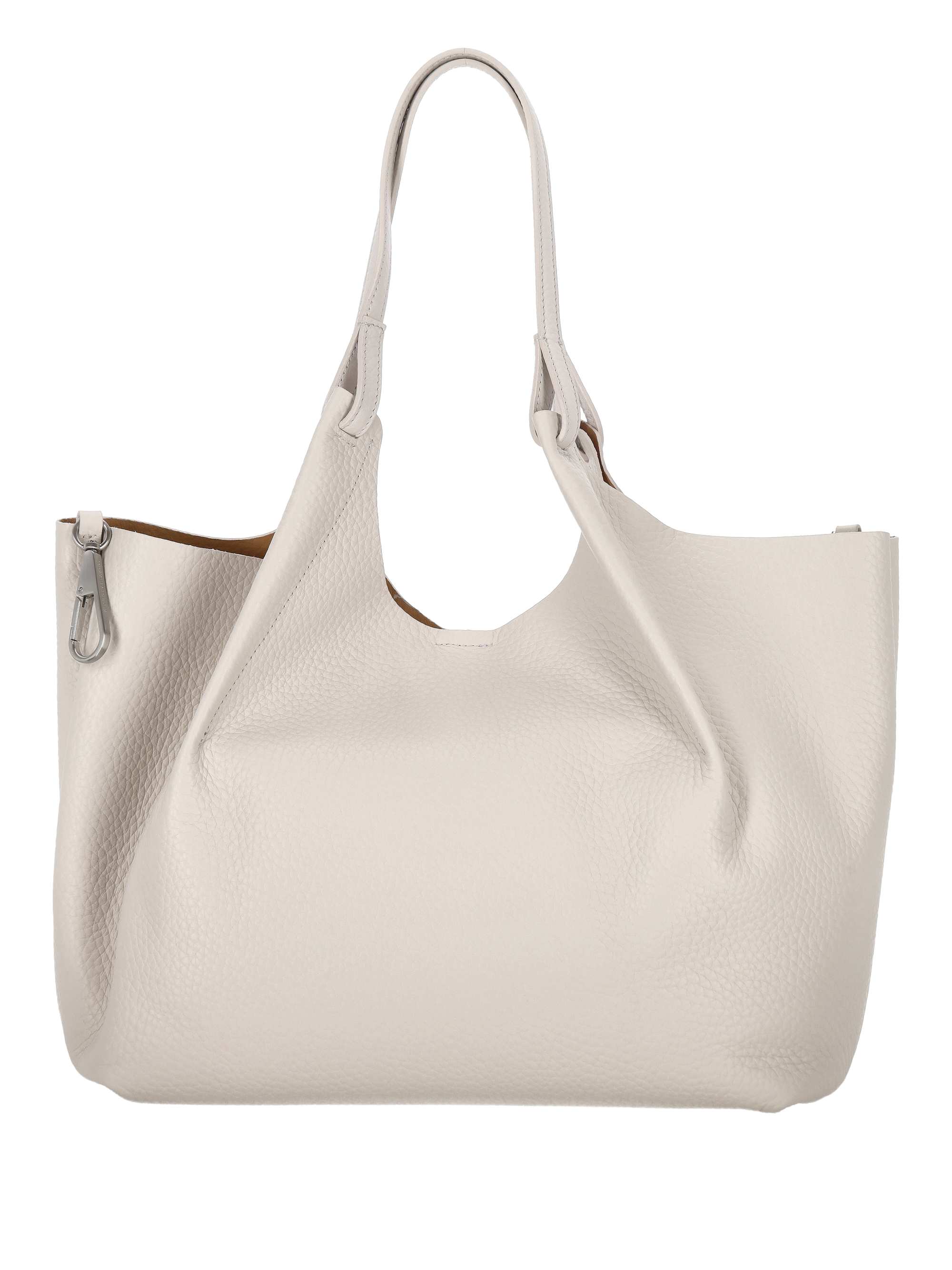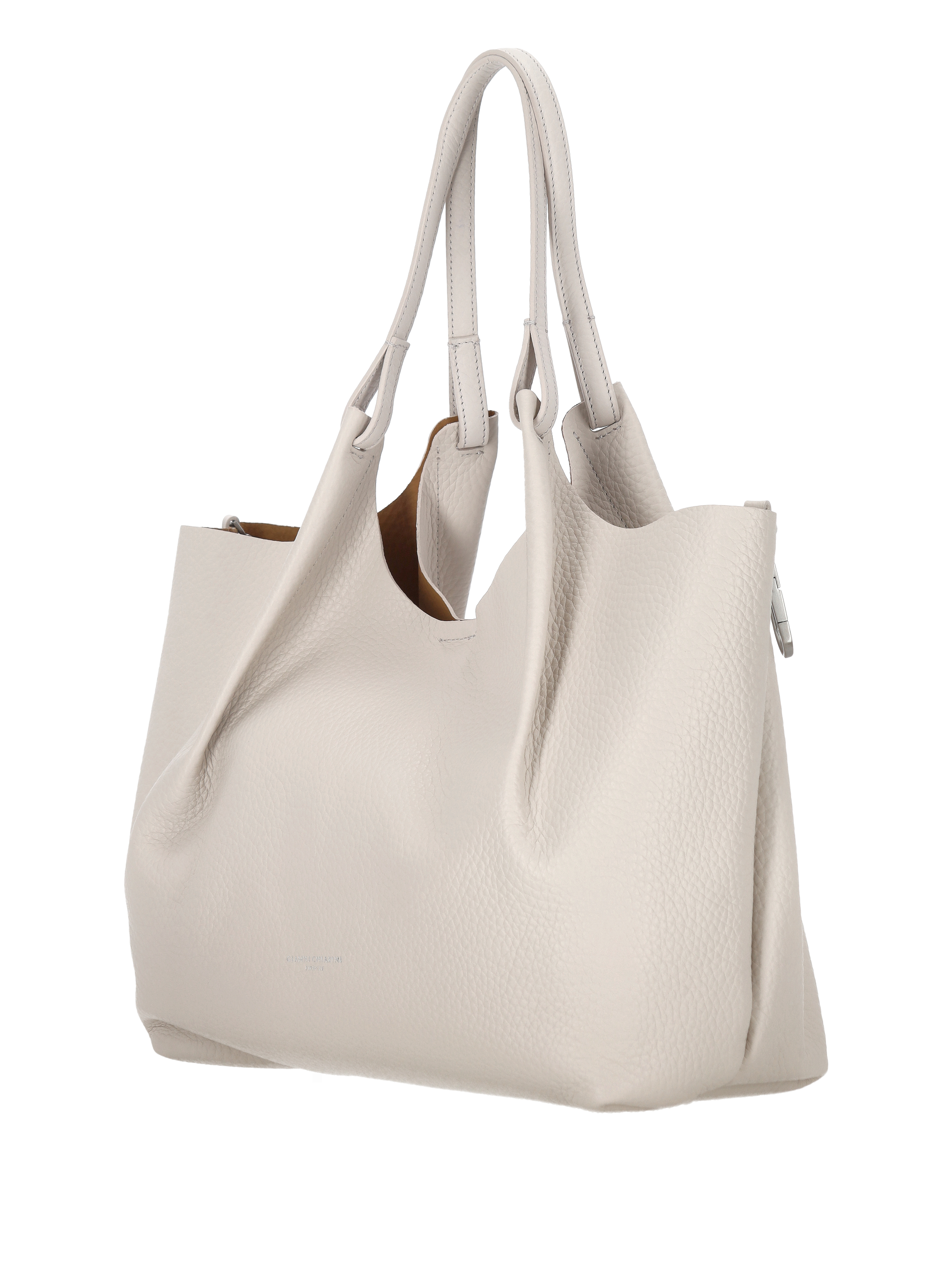 light beige magnetic fastening two flat top handles main compartment This piece comes complete with a protective dust bag
