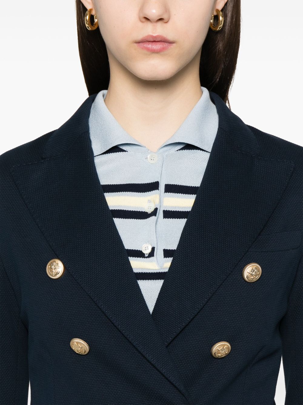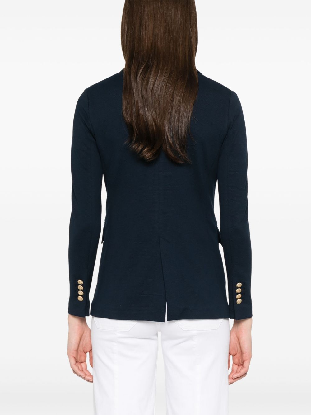 navy blue front button fastening chest welt pocket two side flap pockets Italian rear vents