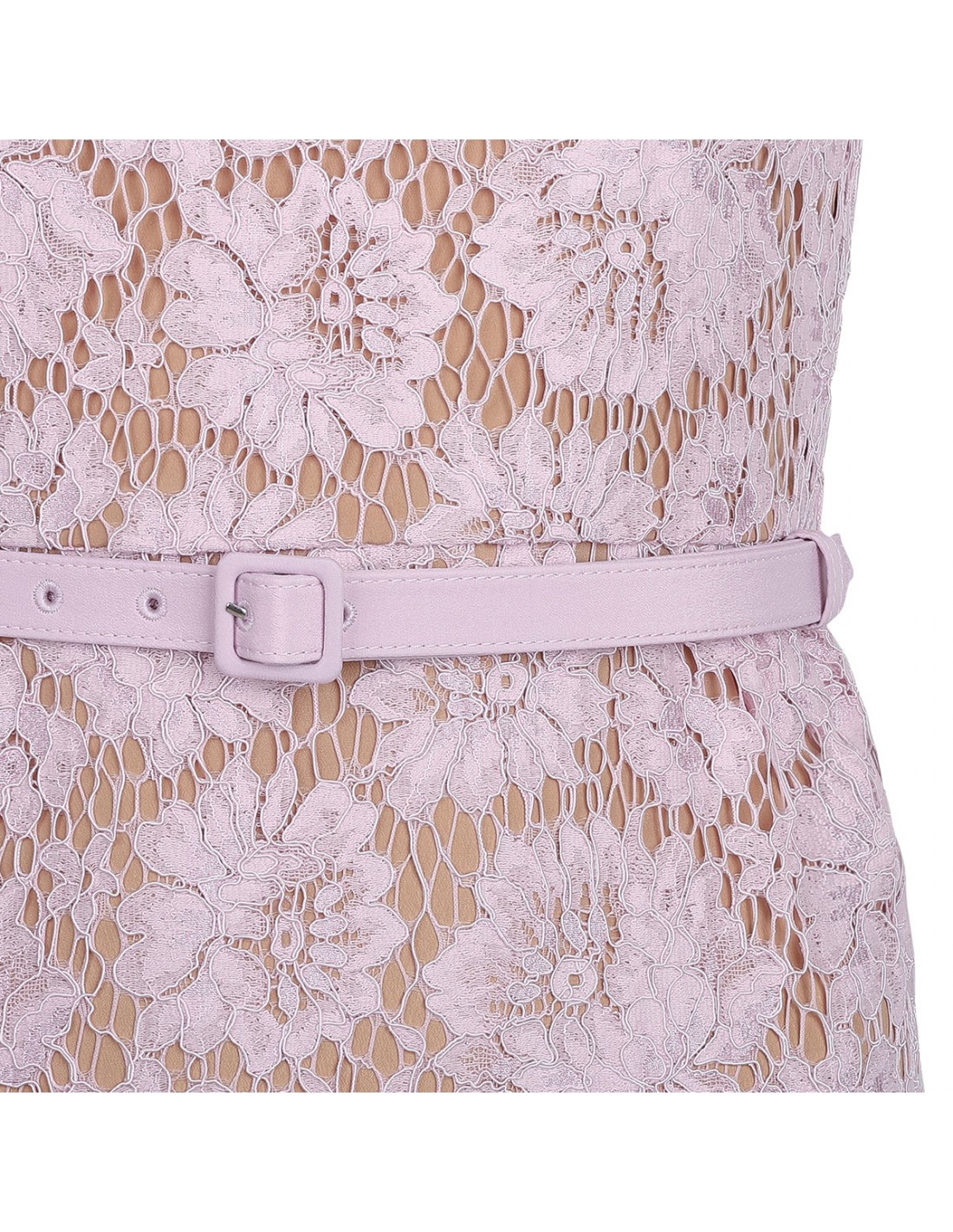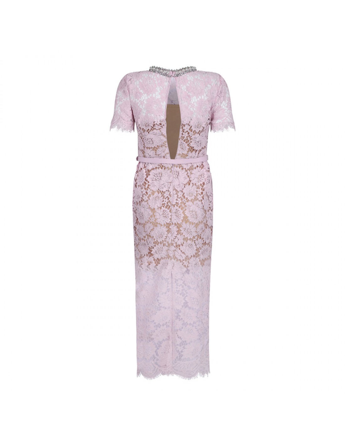 Pink fine lace midi dress from Self Portrait featuring pearl trims, fitted bodice with slightly flared skirt, zip closure at back, short sleeves and detachable belt at waist. Partially lined to knees.