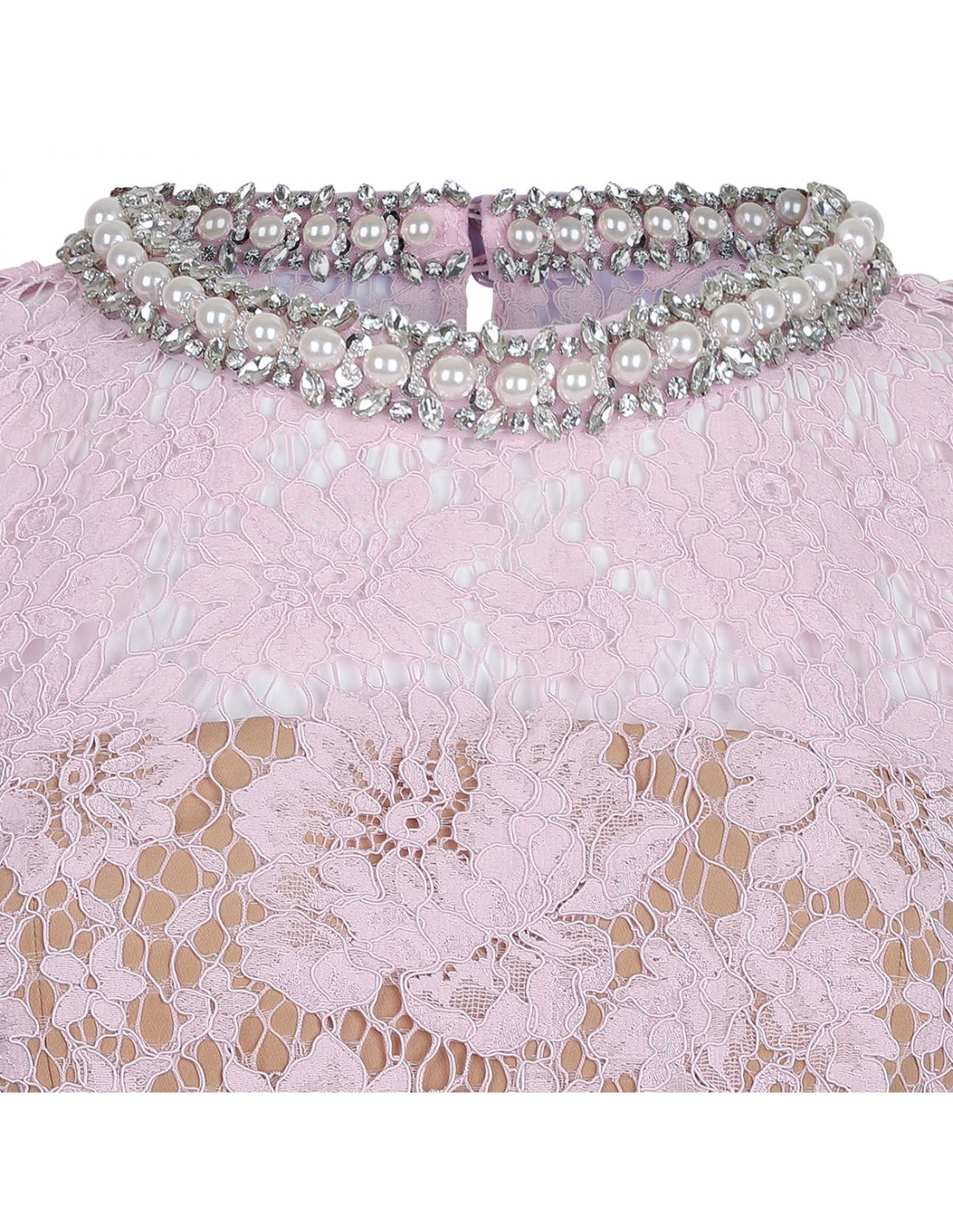 > 핑크 파인 레이스 진주 미디 드레스