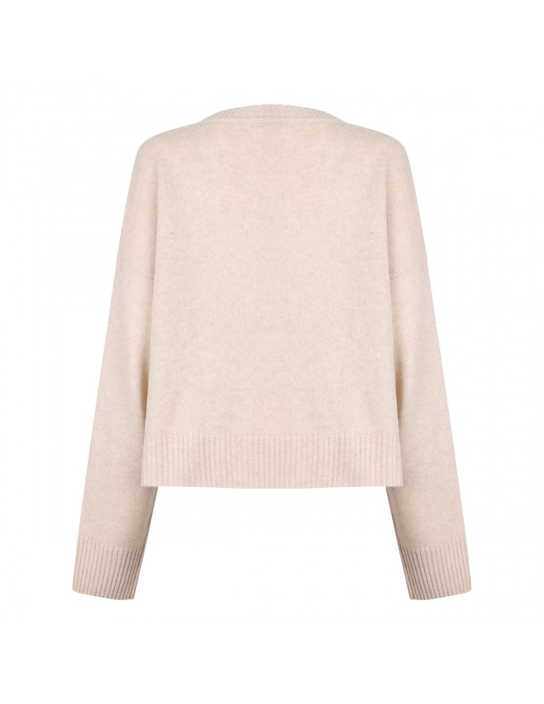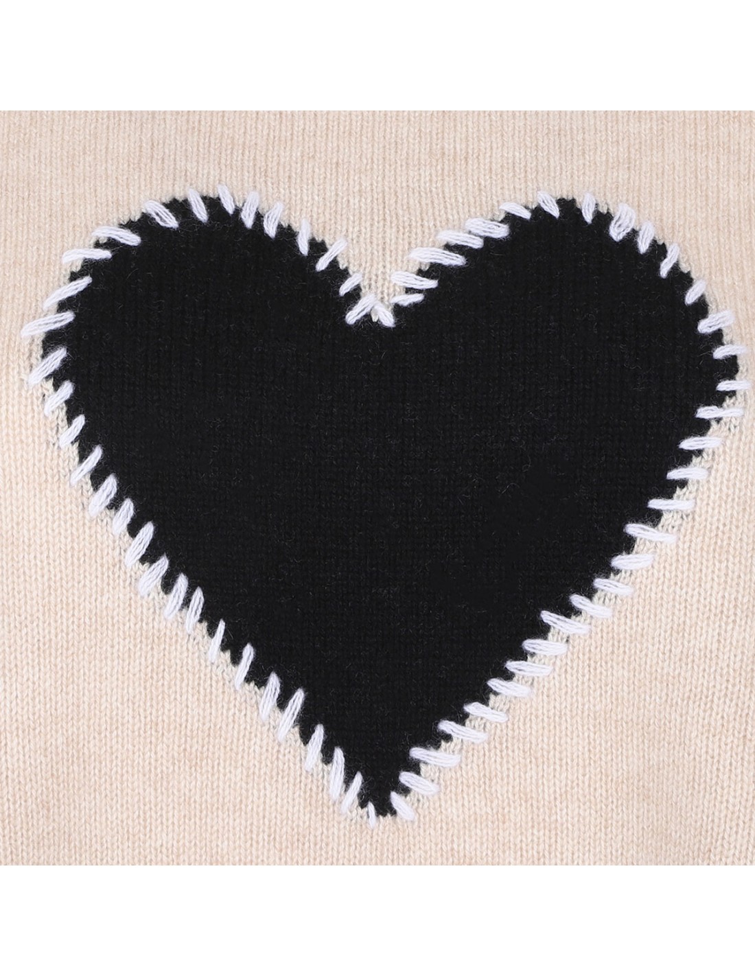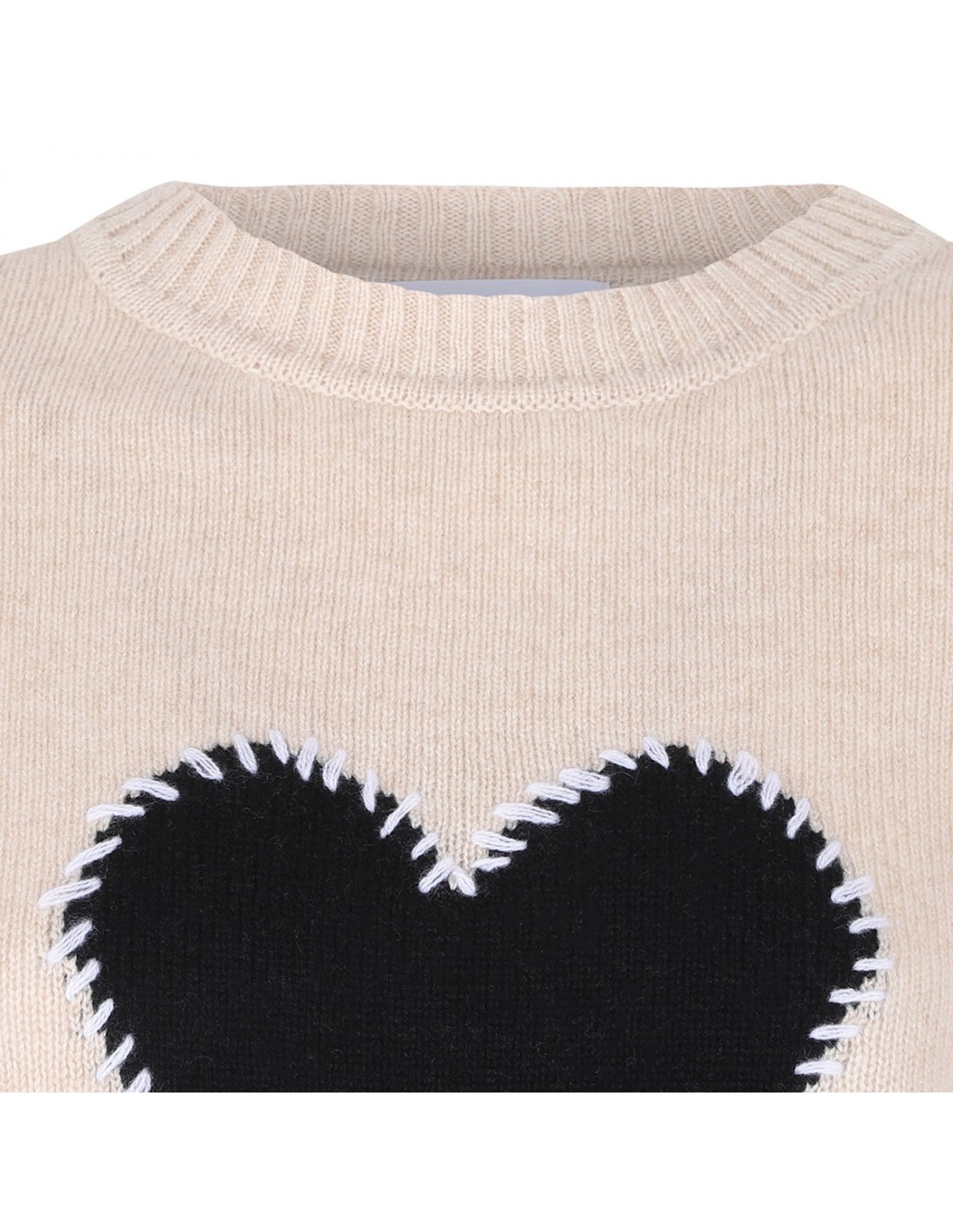 Beige cashmere Robbie jumper from Not Shy featuring contrasting black heart with contrasting stitching, dropped shoulders, long sleeves, crew collar, ribbed-knit edges.