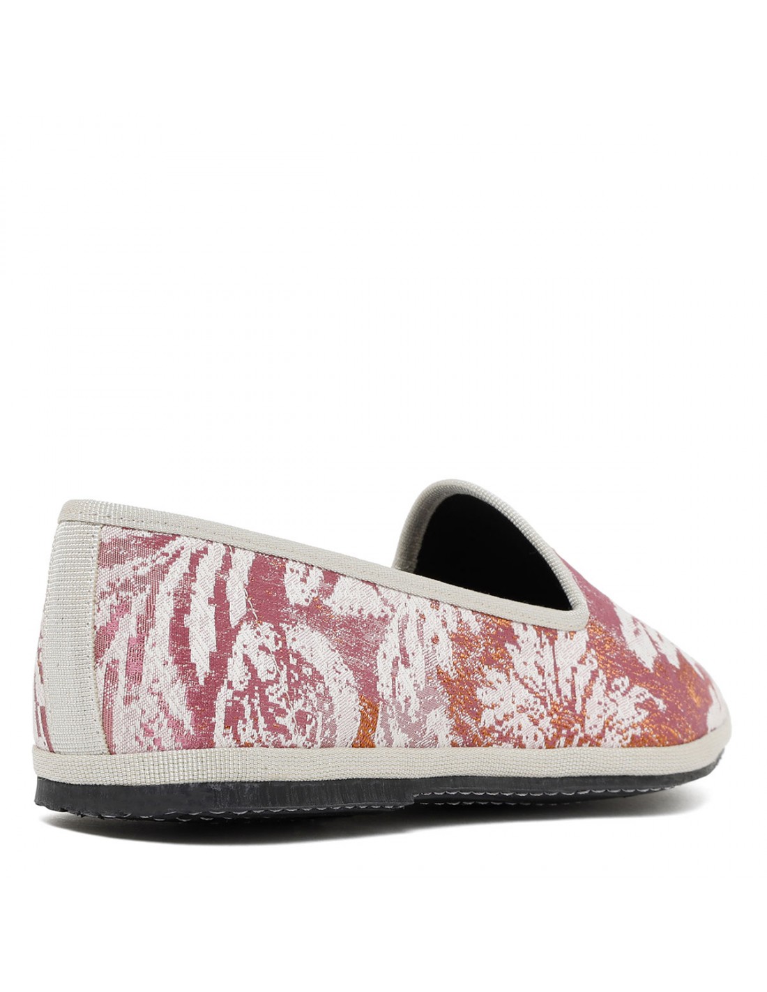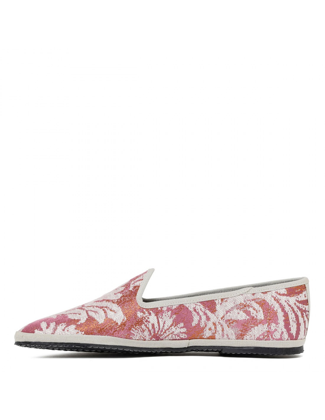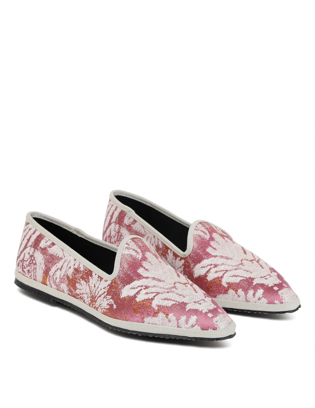 Pink and butter hue brocade silk Grintosa Delizia friulana shoes from CristinaDiMilano featuring jacquard motif, gros-grain edges, pointed toe, slip on design, Alcantara insole, stitched rubber sole.