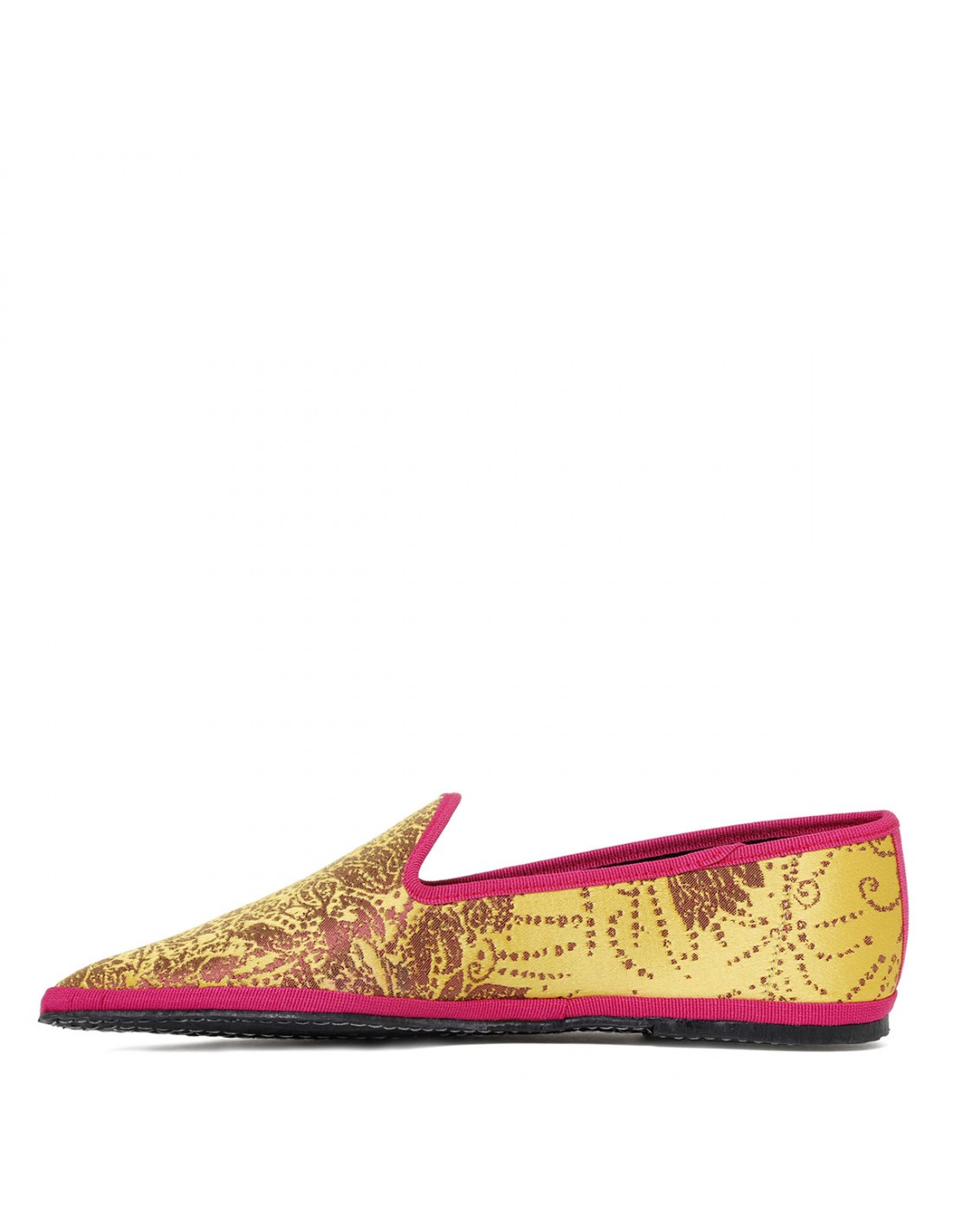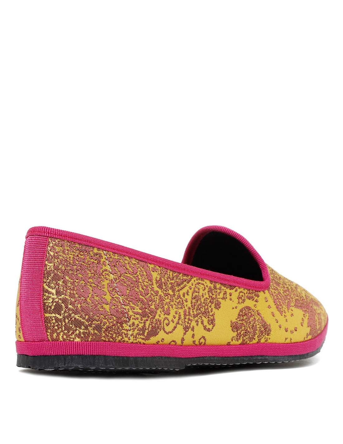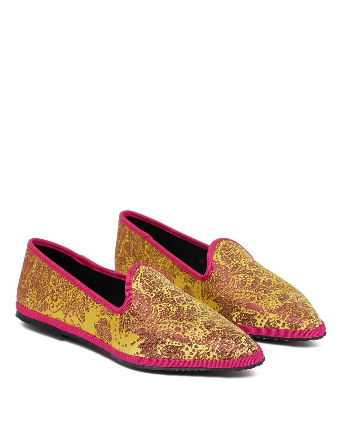 Pink and gold textured cotton and silk Grintosa Bella di Notte friulana shoes from CristinaDiMilano featuring jacquard motif, gros-grain edges, pointed toe, slip on design, Alcantara insole, stitched rubber sole.