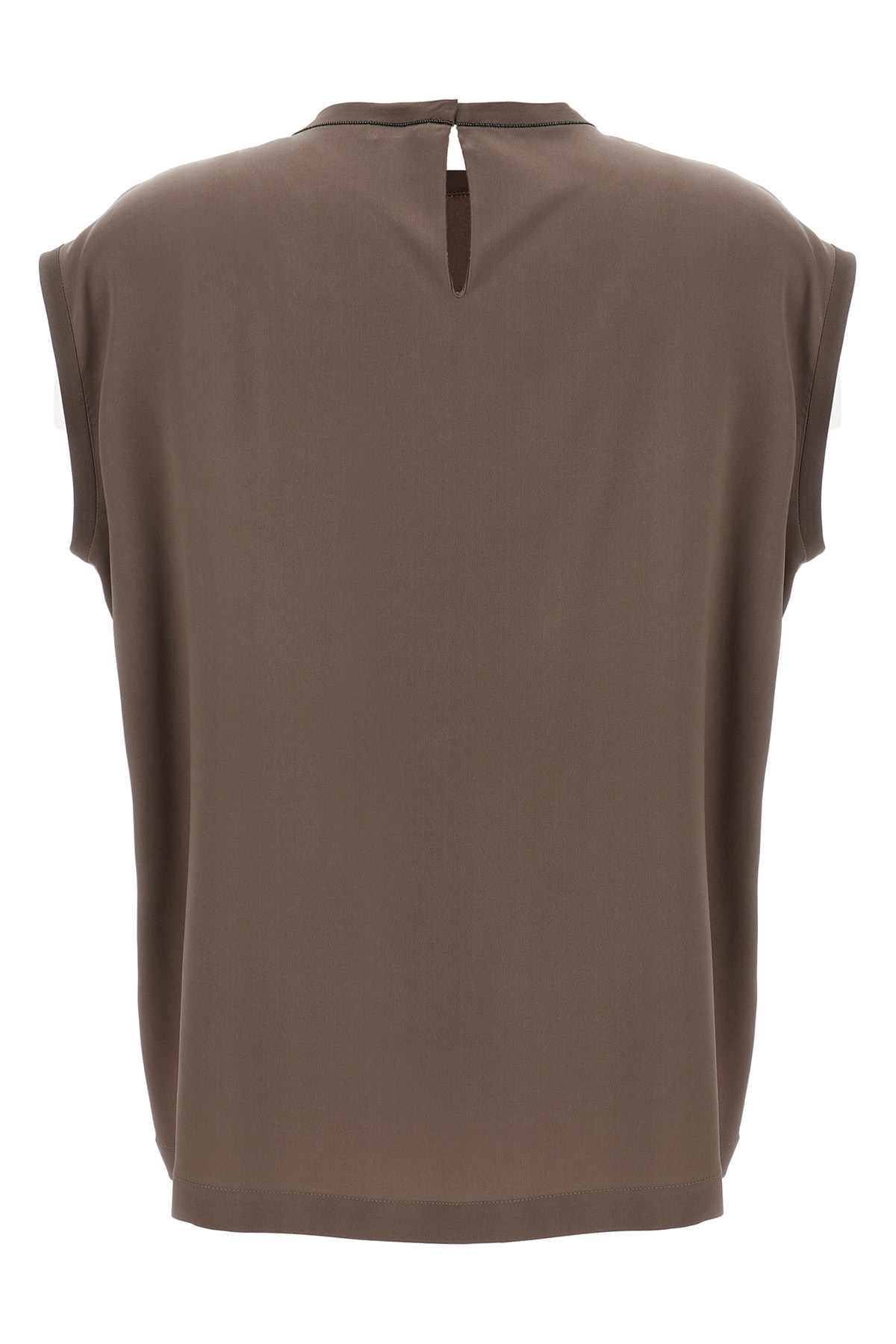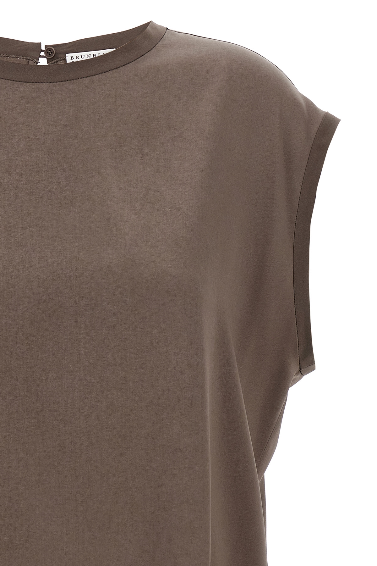 Silk crewneck blouse, back button closure with cut-out teardrop and Monile detail, short sleeves.