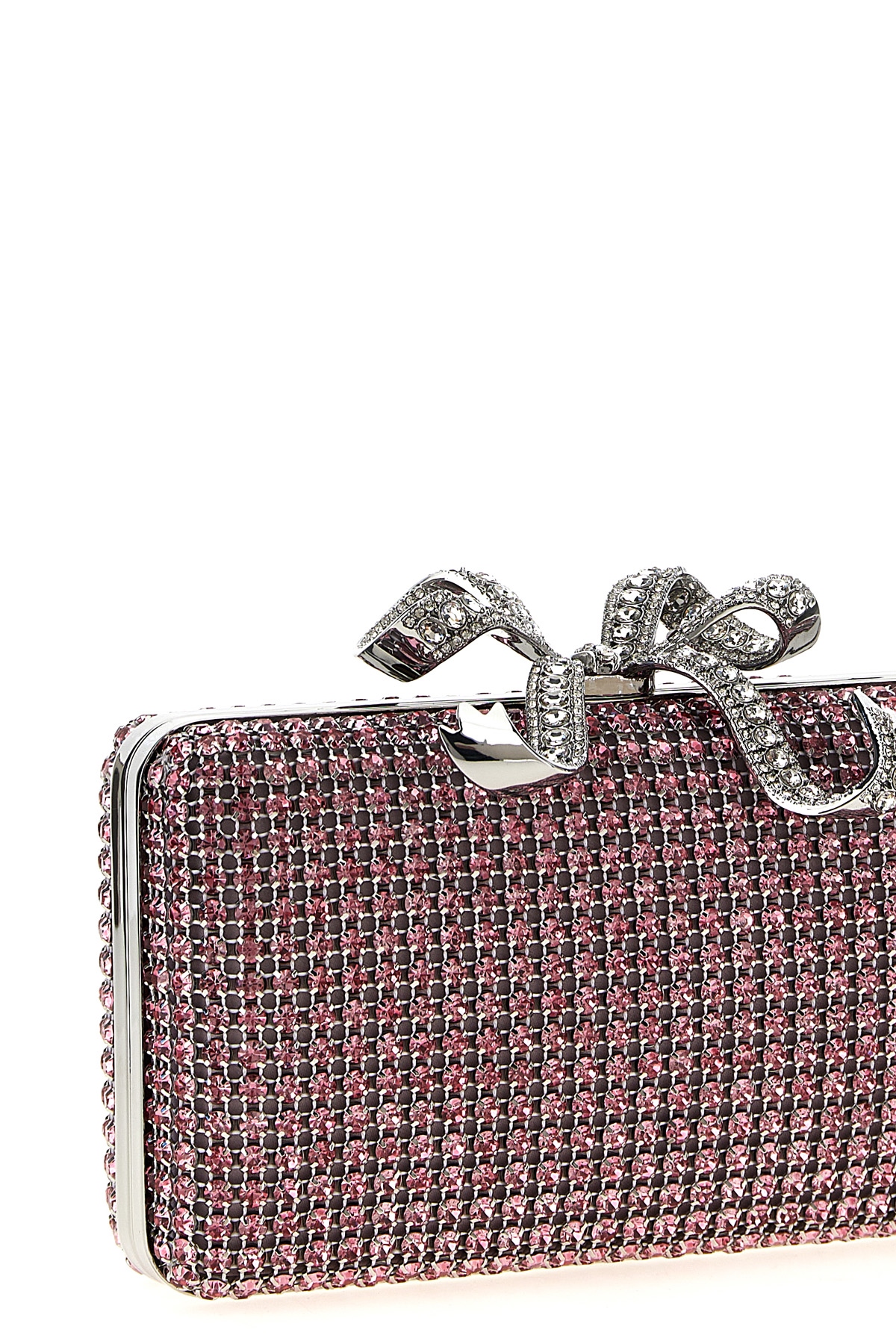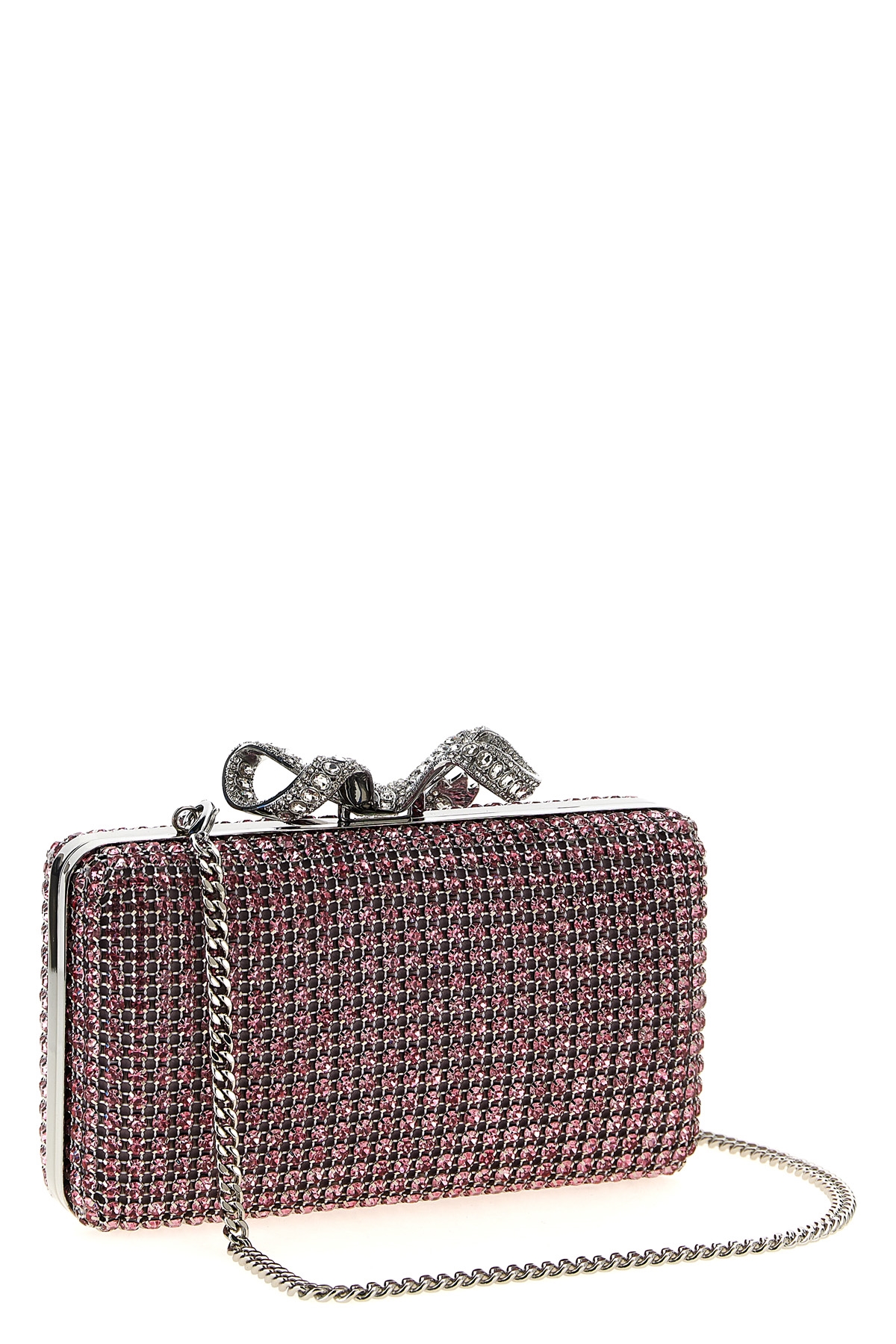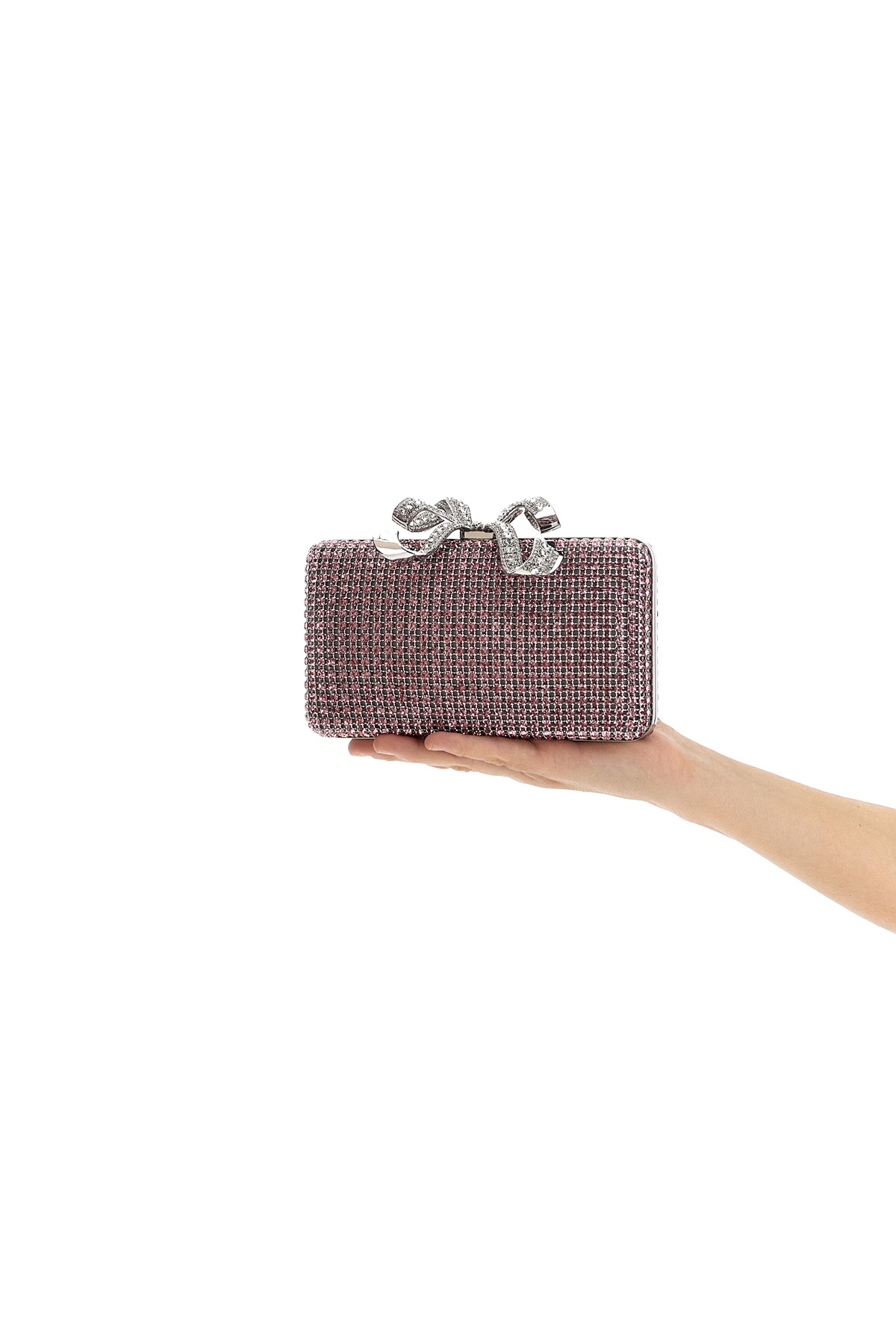 'Pink Crystal Box' clutch with all-over crystals, magnetic closure, top jewel bow application, removable chain shoulder strap.